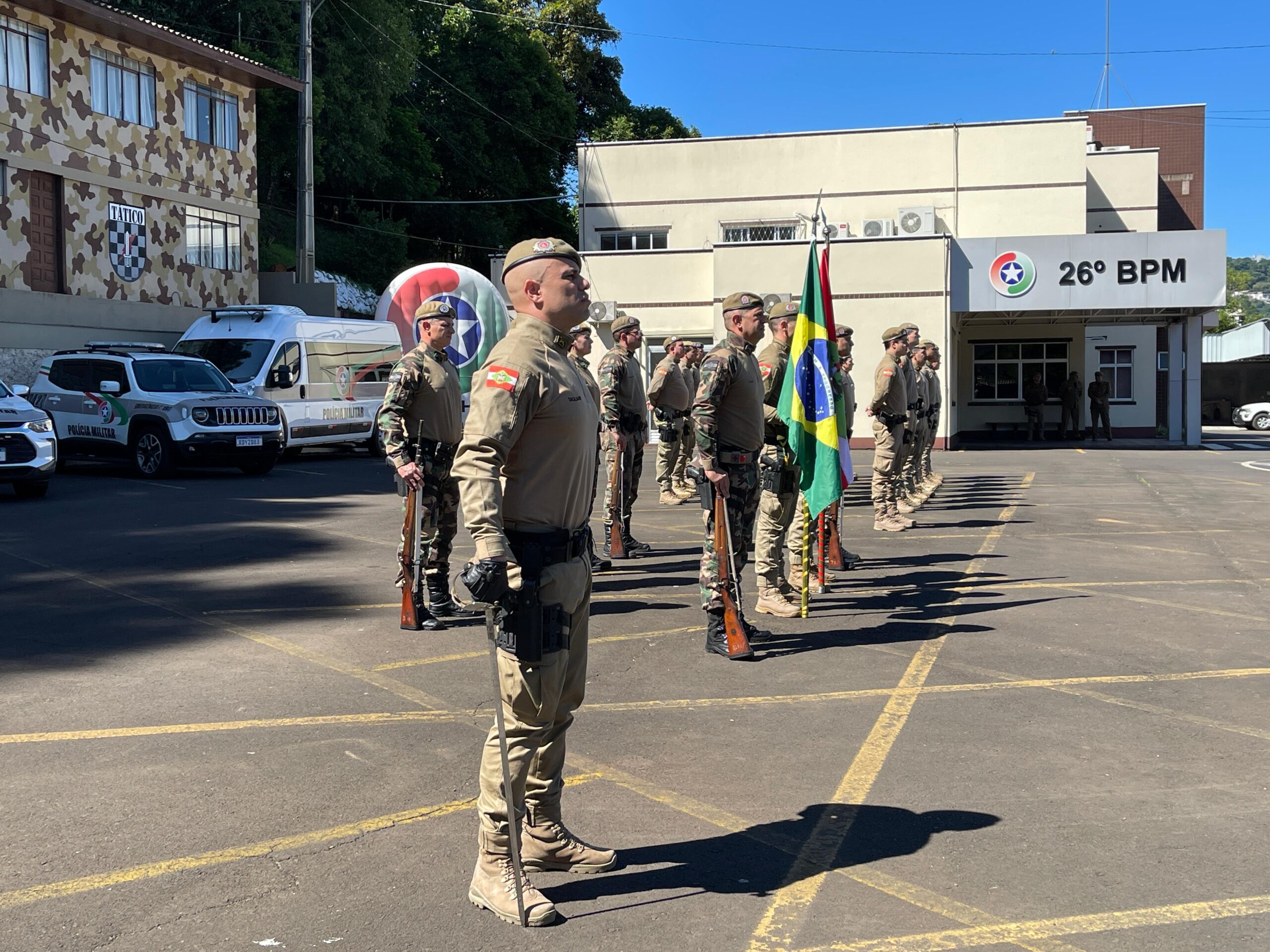 Na manhã desta terça-feira (25), o 26º Batalhão de Polícia Militar (BPM), sediado em Herval d’Oeste, realizou a solenidade de promoção de oficiais e praças da Polícia Militar de Santa Catarina (PMSC), em comemoração ao Dia de Santa Catarina, celebrado em 25 de novembro.