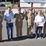 Na sequência, foi concedido os Certificados de Honra ao Mérito ao 2º Sgt PM RR Adair e ao 3º Sgt PM RR De Moura, como forma de homenageá-los pelos serviços prestados à PMSC. Ainda no intuito de reconhecer as pessoas que contribuem para o sucesso da nossa instituição, foi conferido o título honorífico “Amigo da Polícia Militar de Santa Catarina” ao Sr. Reginaldo José del Castanhel e ao Sr. Luiz Carlos Chiocca, empresários da cidade de Campos Novos/SC.