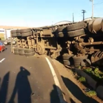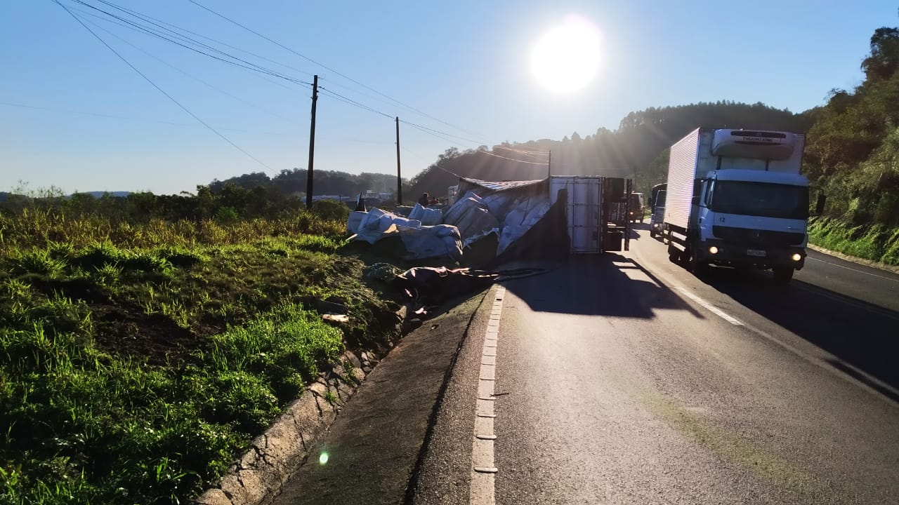 O caminhão capotou e está tombado na margem da rodovia. O trânsito está sendo sinalizado.