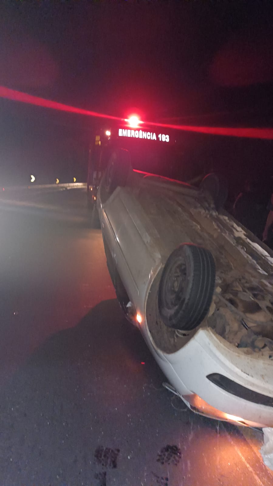 No local foi constatado que um GM/Corsa encontrava-se capotado sobre a pista. O condutor, de 23 anos, encontravam-se fora do veículo, consciente e orientado, não apresentava ferimentos aparentes e queixava-se de fortes dores na região do peito.