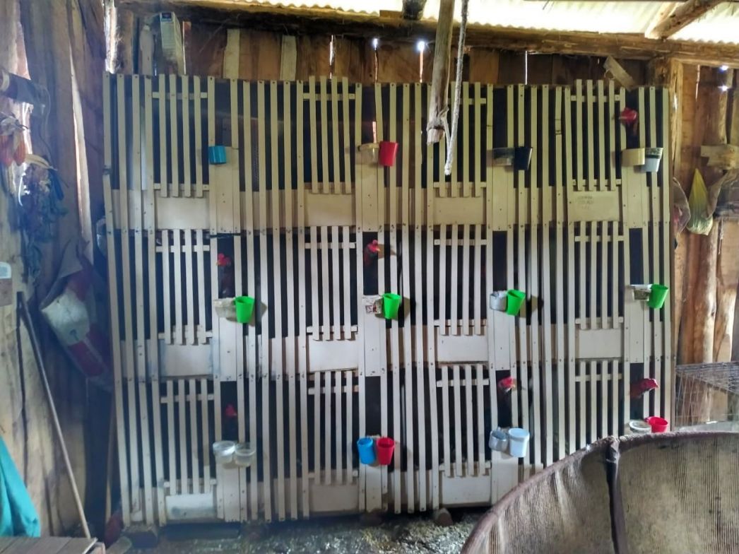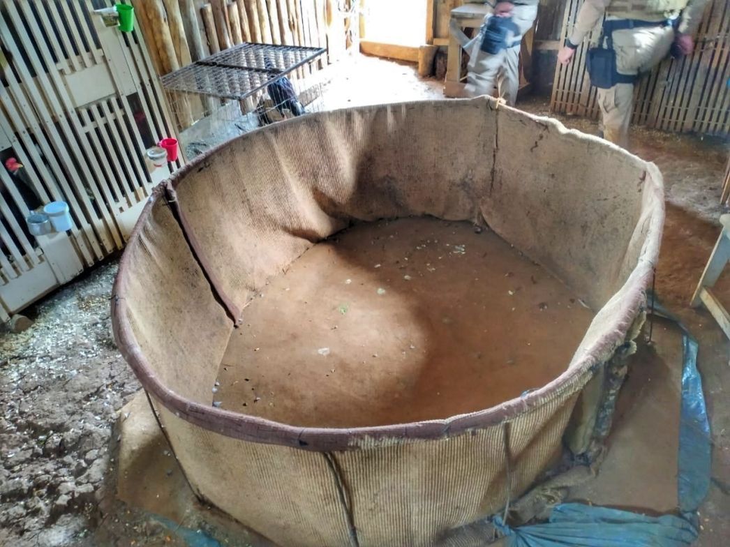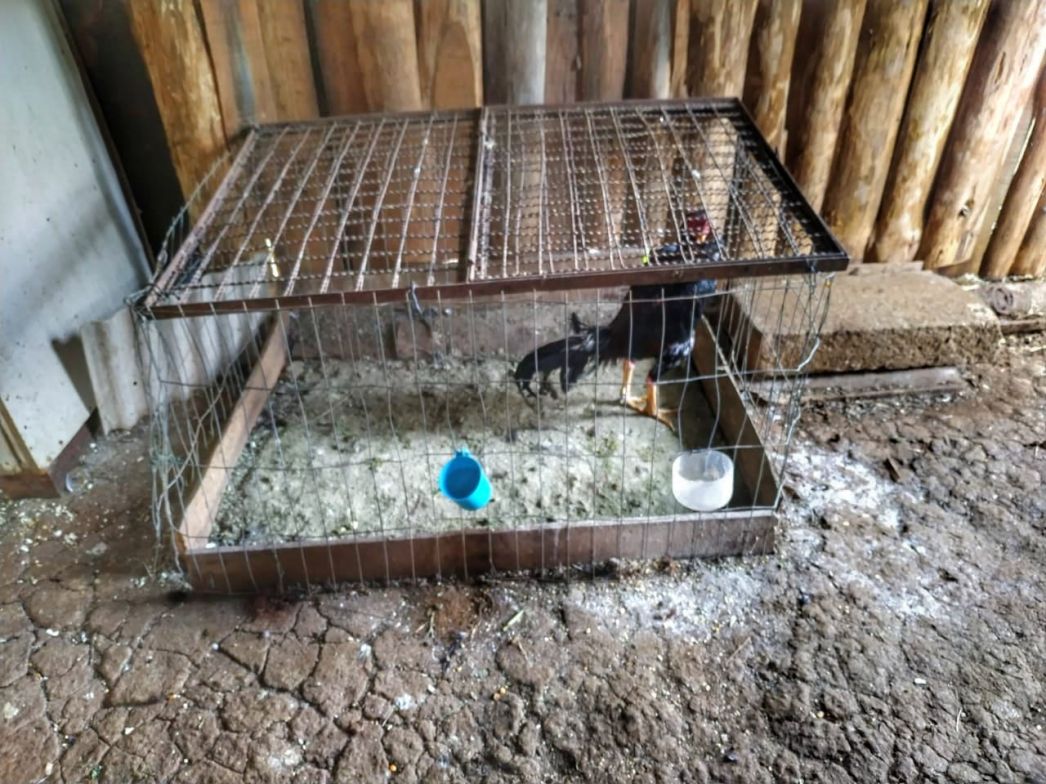 Os policiais também flagraram uma possível rinha de galo em um galpão, onde haviam vários galos fechados em gaiolas e uma cancha que possivelmente era utilizada para a prática.