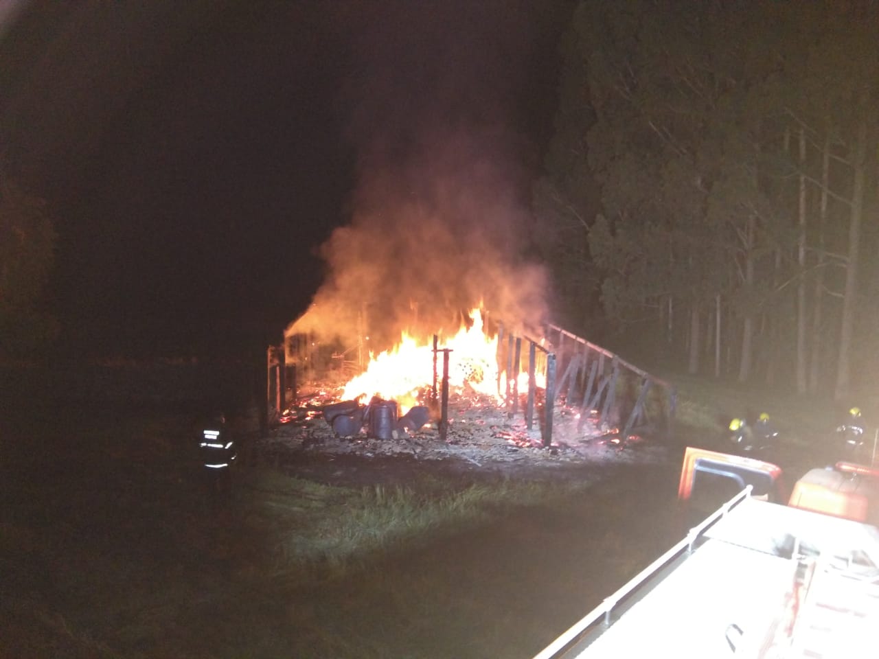 Barracão de madeira é consumido pelo fogo no interior de Curitibanos