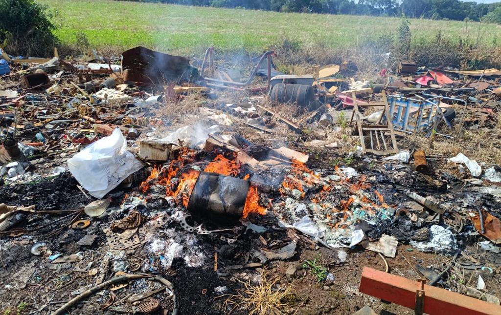 Os policiais militares realizavam patrulhamento, quando avistaram a presença de fogo, em uma propriedade particular. Ao realizar averiguação foi constatado que o fogo provocava a queima de sacos de adubos. Ainda, foi flagrado um grande volume de latas de tintas, filtros de óleo e sementes de culturas agrícolas com tratamento químico dispostos a céu aberto, de forma totalmente inadequada. Os resíduos encontrados têm grande potencial poluidor.