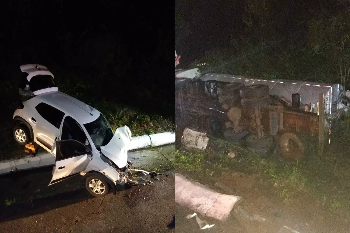 Conforme o Corpo de Bombeiros Militar de Chapecó e Xaxim, a colisão frontal envolveu um caminhão e um carro Kwid. No carro estava o motorista, consciente, mas preso nas ferragens.