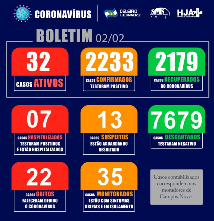 Nesta terça-feira, dia 2 de fevereiro, a Secretaria Municipal de Saúde de Campos Novos divulgou o Boletim do Covid-19 que registra 32 casos ativos para o Coronavírus na cidade.