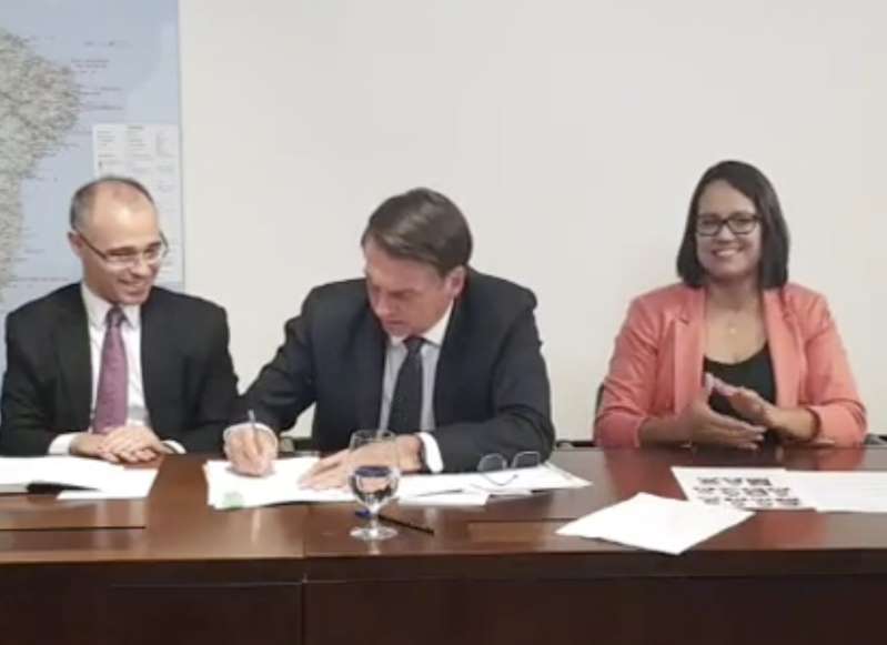 A assinatura foi feita em live no Facebook ao lado dos ministros André Mendonça (Advocacia Geral da União) e Abraham Weintraub (Educação), do líder do Governo na Câmara, Major Vitor Hugo (PSL-GO), além da intérprete de libras Elizângela Castelo Branco.