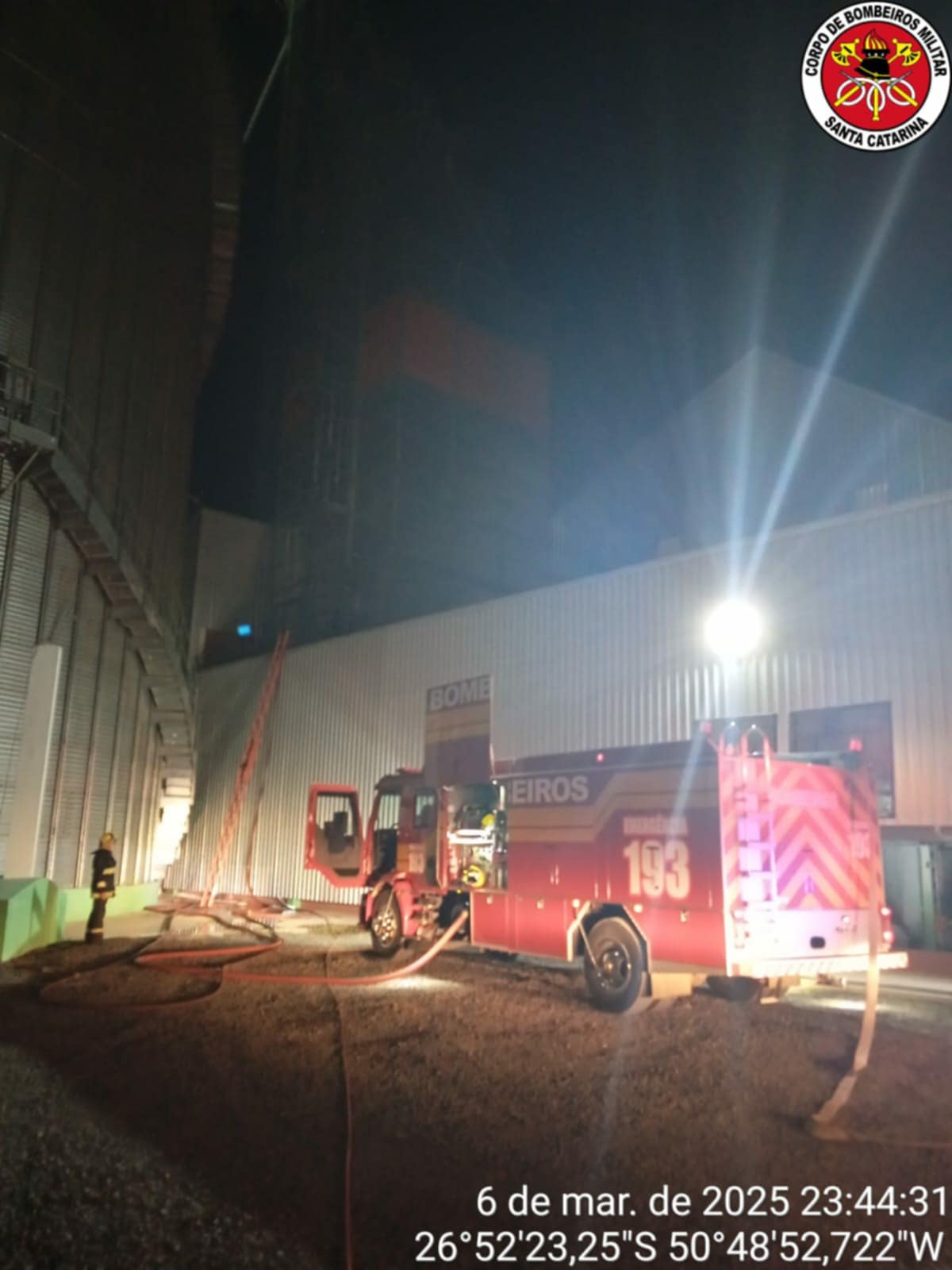 Bombeiros de Lebon Régis e de Caçador combatem incêndio em secador de grãos