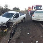 E um automóvel Renault/Logan com placas de Tangará, conduzido por uma mulher de 40 anos, que estava no veículo, consciente, orientada, sinais vitais estáveis, escoriação e hematomas nas pernas, foi realizada avaliação inicial, dirigida e encaminhada ao Hospital Municipal Frei Rogério pelos bombeiros de Campos Novos. Foi realizada a limpeza da pista, os veículos e o local ficaram aos cuidados da Polícia Militar Rodoviária.