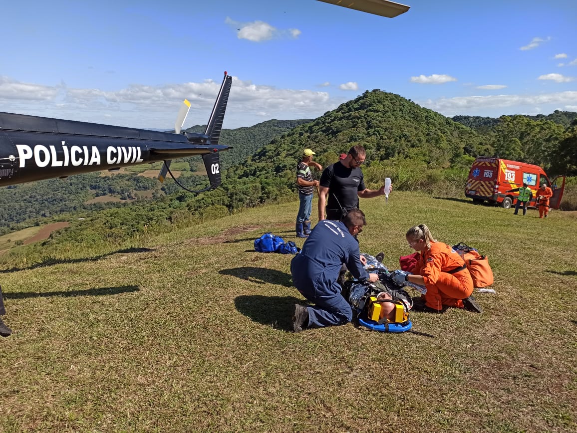 Seara – O SARA/SAERFRON atendeu nesta sexta-feira (10) a uma vítima de queda de altura no interior de Seara. A equipe aeromédica foi acionada pelo Corpo de Bombeiros da cidade. A vítima, de 46 anos, teve queda com parapente de aproximadamente 30 metros. A vítima encontrava-se em mata fechada, em encosta íngreme, sem possibilidade de ser içado por rapel. Houve a estabilização da vítima no local, imobilização com colar cervical e prancha rígida, acesso venoso e carregado pelo interior da mata até o helicóptero.