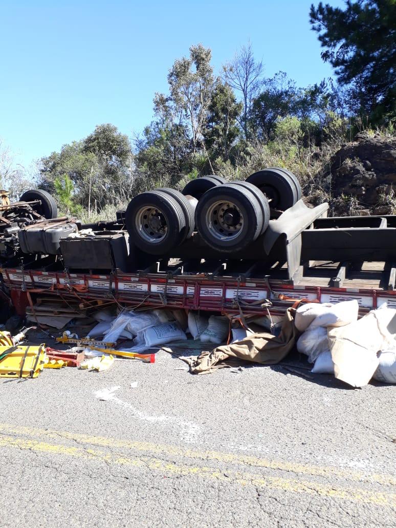 A carreta fazia o sentido Chapecó. O motorista de 47 anos relatou que perdeu o controle da direção saindo da pista. Ele apresentava ferimentos considerados leves e referia dores nas costas e braços. A Polícia Rodoviária Federal também foi acionada para prestar apoio.