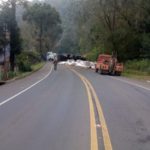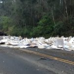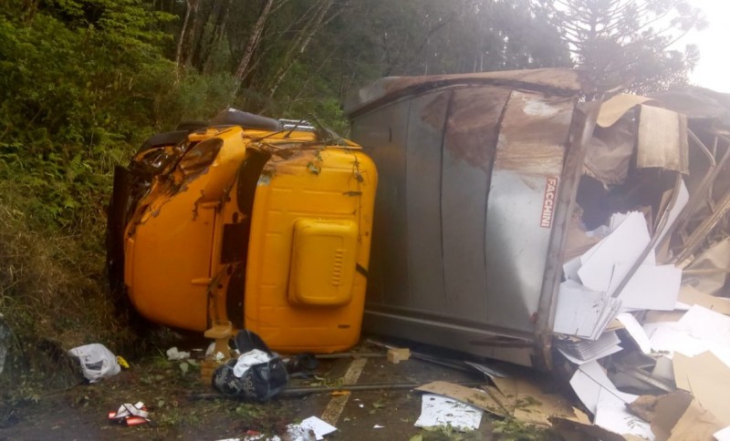 Um caminhão Mercedes-Benz com placas de Videira tombou por volta das 7 horas desta quinta-feira (23) na SC- 453, próximo ao Batalhão da Polícia Militar Rodoviária de Ibicaré. De acordo com informações, o motorista saiu da pista após perder o controle da direção e colidir contra o barranco. O veículo ficou atravessado na rodovia e a carga espalhada no asfalto.