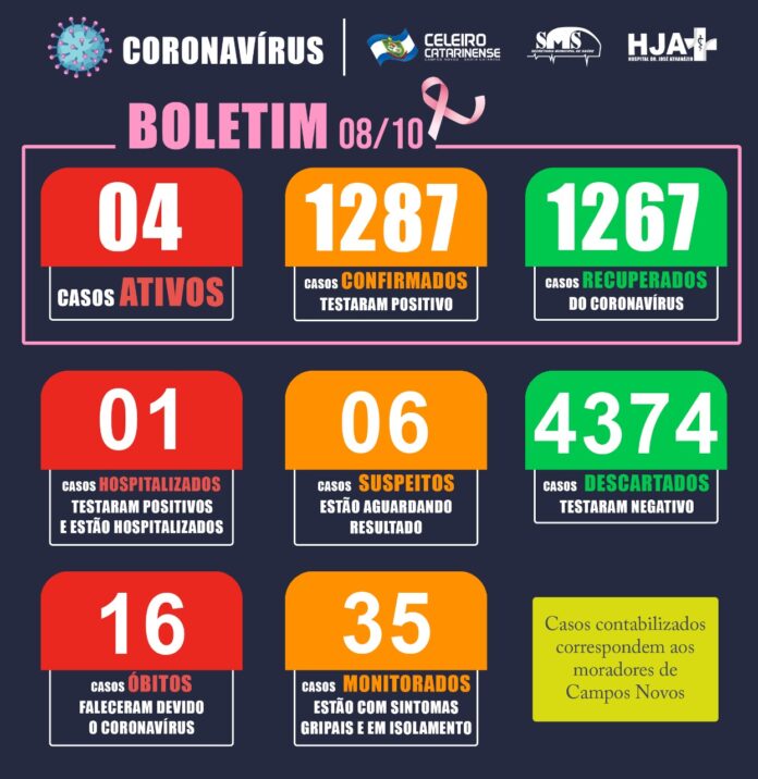 Ainda de acordo com os dados da Secretaria Municipal de Saúde, são 4.374 casos descartados,06 suspeitos e 35 pessoas em monitoramento. Apenas um morador de Campos Novos se encontram hospitalizado sendo no Hospital Dr. José Athanázio.