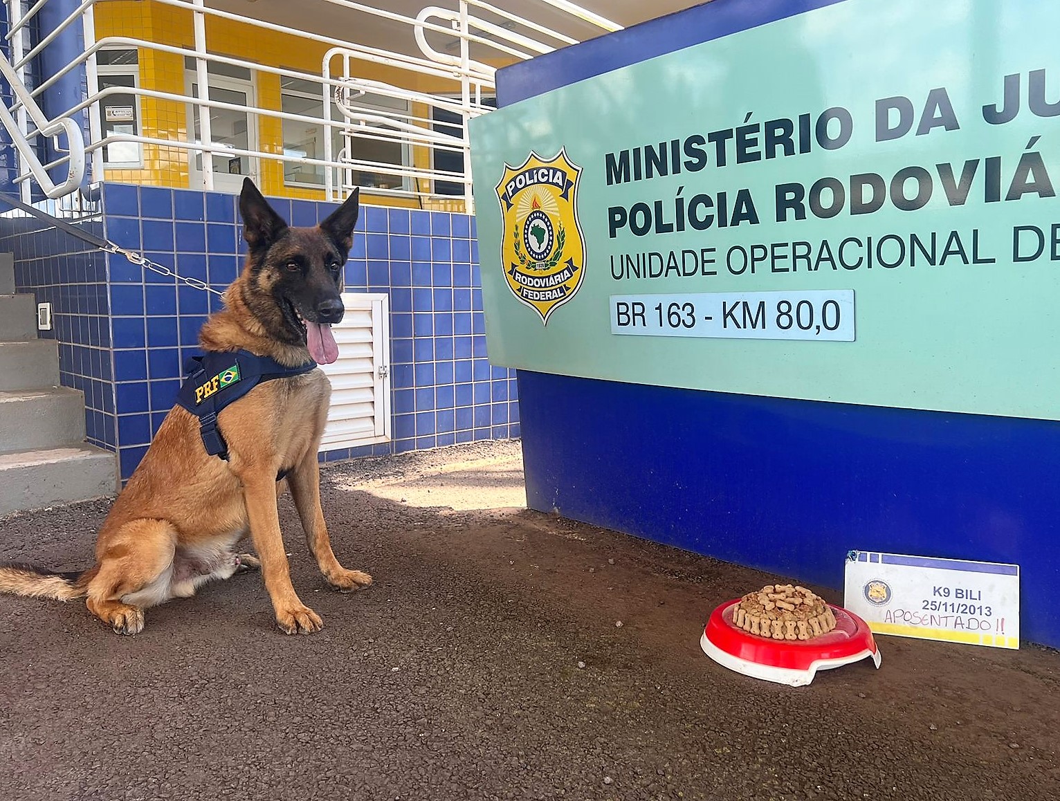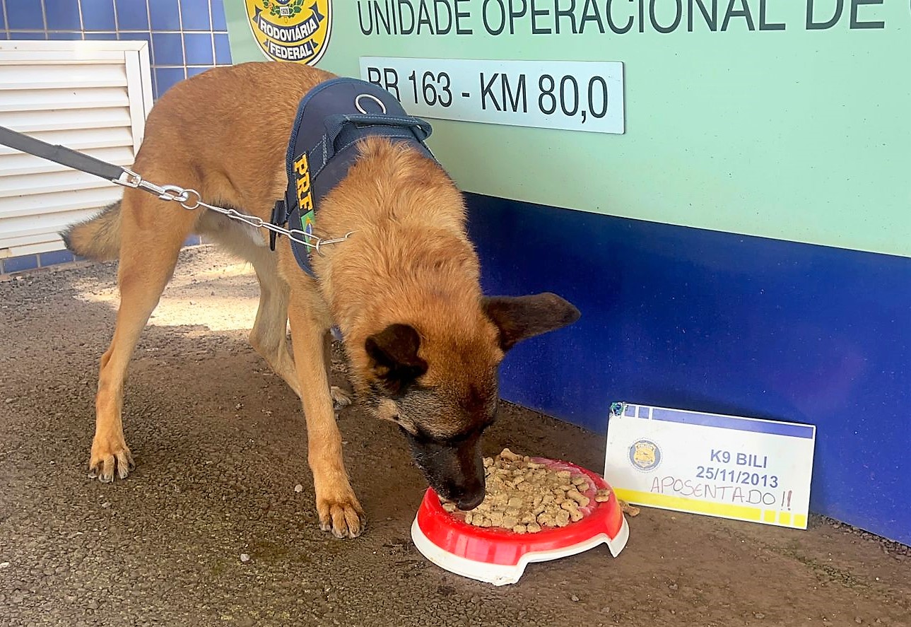 Na despedida da equipe do GOC (Grupo de Operações com Cães) da PRF em SC, localizada na Unidade Operacional na BR-163 em Guaraciaba, Bili ganhou festa com direto a bolo feito da ração preferida dele, enfeitado com biscoitos.