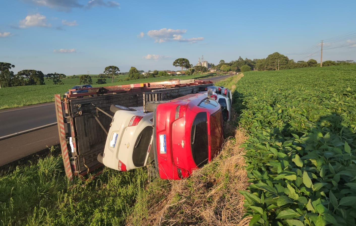 Uma carreta cegonha saiu da pista e tombou nas margens da BR-282 na madrugada desta quinta-feira (26). O veículo transportava sete carros de passeio, todos já usados.