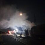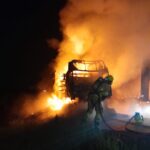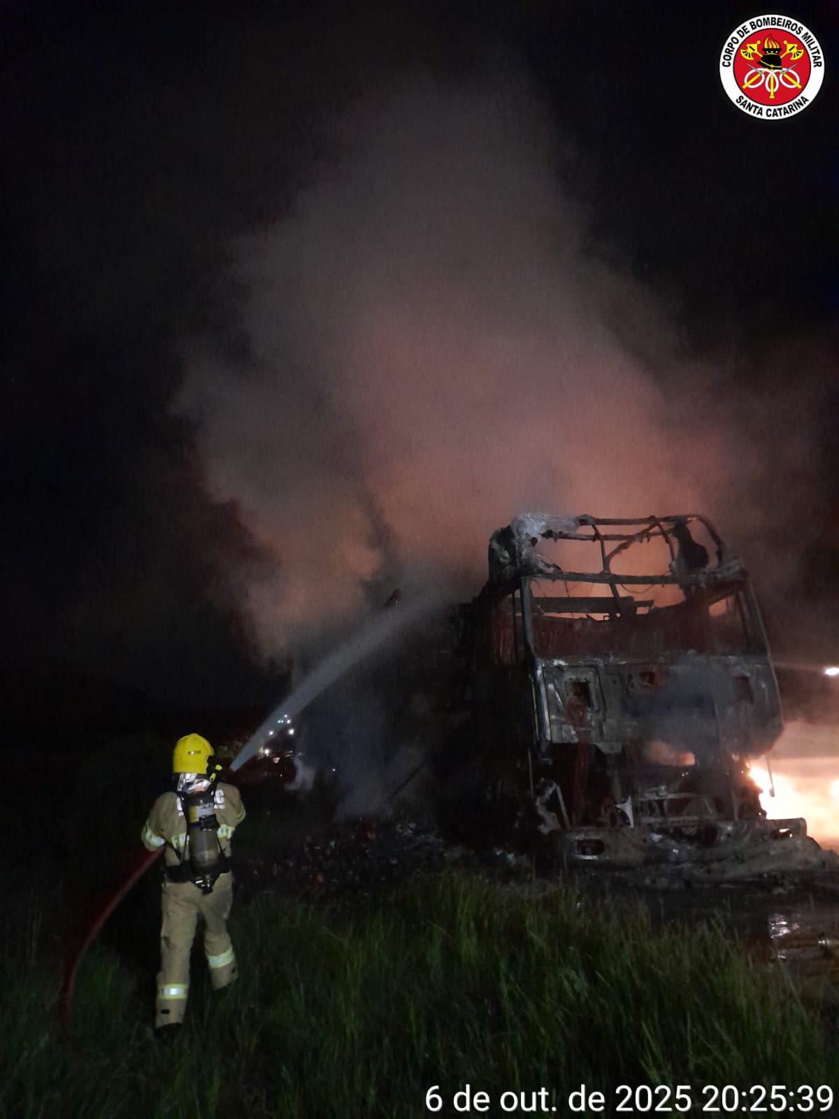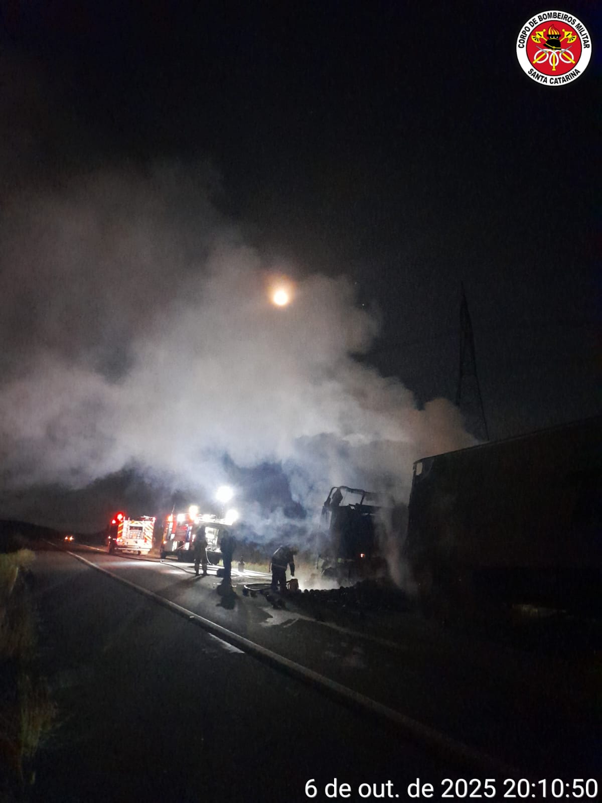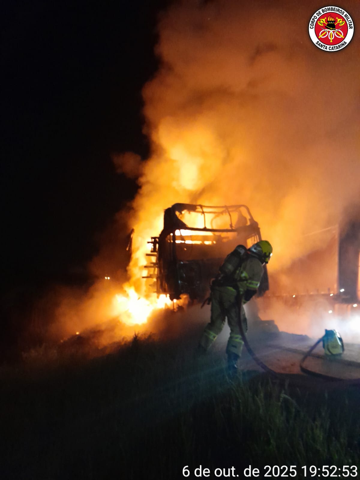 Ao chegar ao local, as equipes confirmaram a ocorrência, encontrando o veículo totalmente tomado pelo fogo, especialmente na cabine, na parte frontal do baú e em parte da carga de embutidos, que se espalhou sobre a pista.