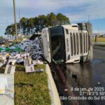 Uma carreta carregada com vinhos tombou em um trevo, na tarde desta quarta-feira (08), na BR-470, em São Cristóvão do Sul.