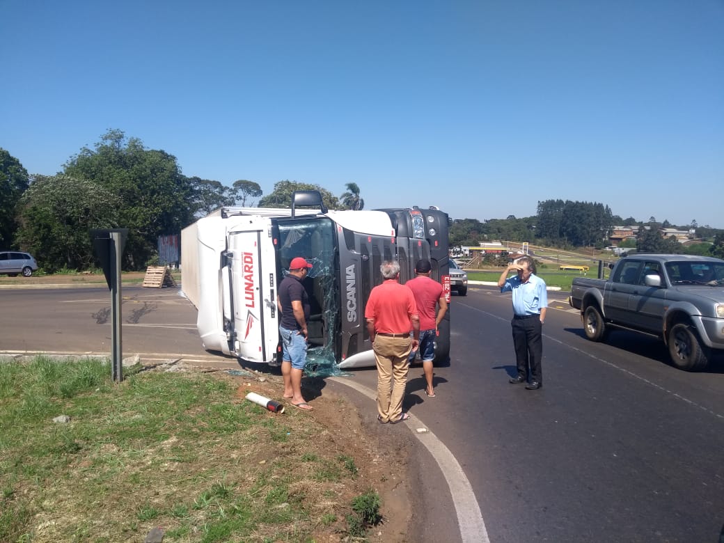 Faxinal dos Guedes – O motorista de uma Scania, com placas de Horizonte (CE), tombou a carreta na manhã deste sábado, dia 12, em um trevo no município de Xaxim. O acidente acontece por volta das 10 horas da manhã.