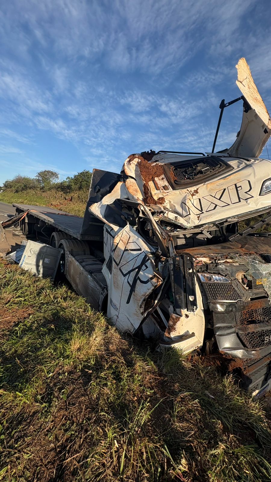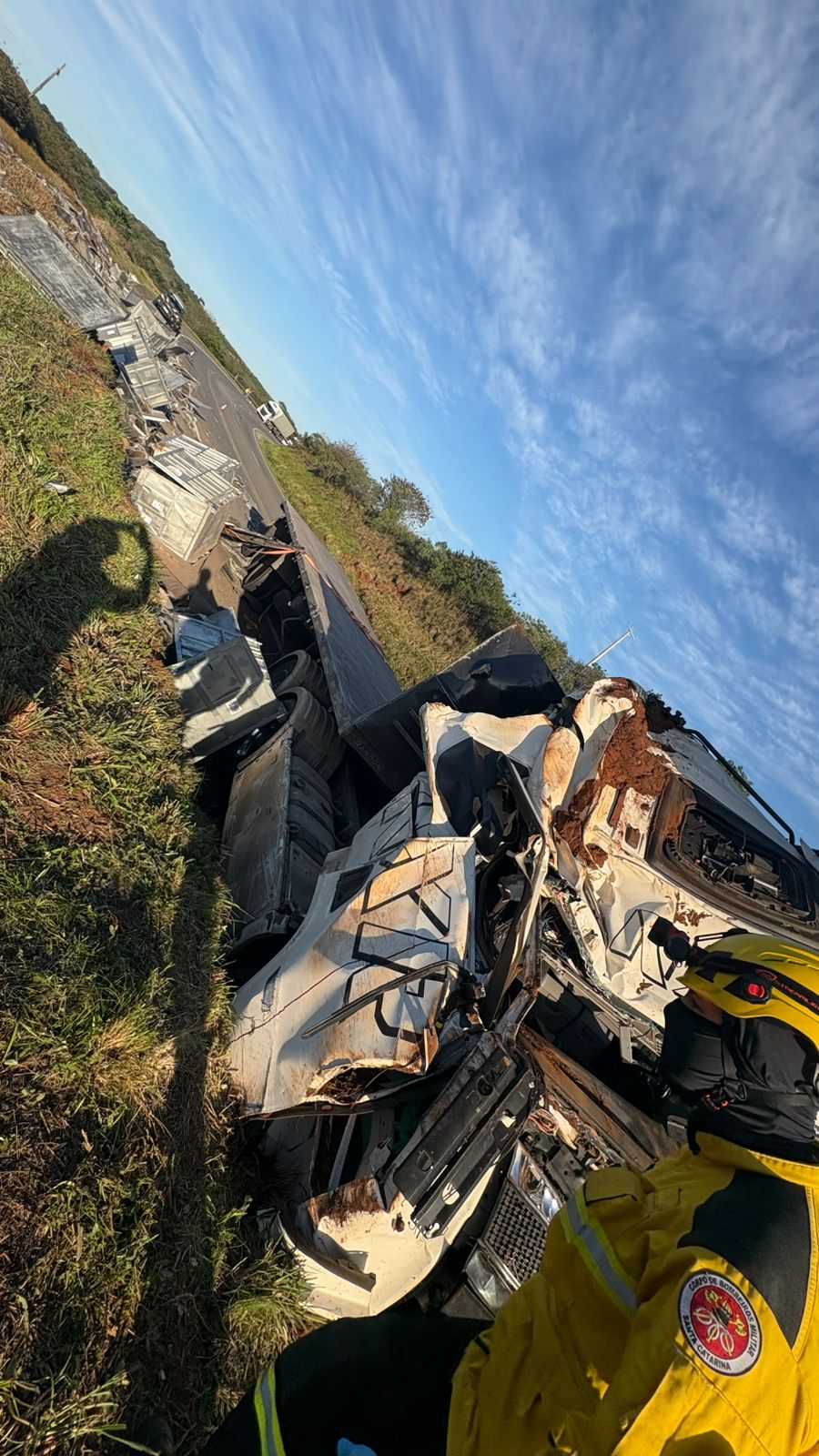 A motorista foi encontrada caída lateralmente, consciente, porém com confusão mental, e encarcerada no interior da cabine. As equipes utilizaram uma ferramenta combinada para expandir o painel e remover partes plásticas, possibilitando o acesso à vítima.