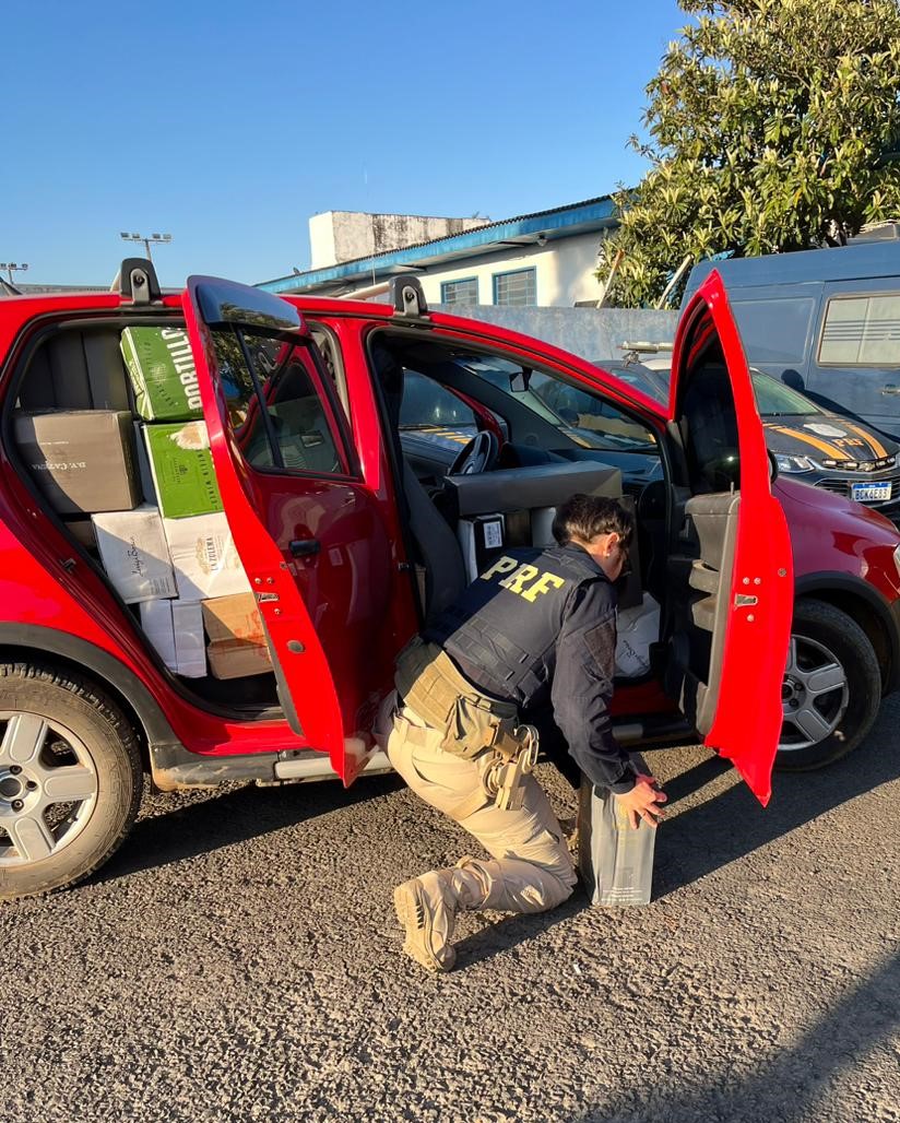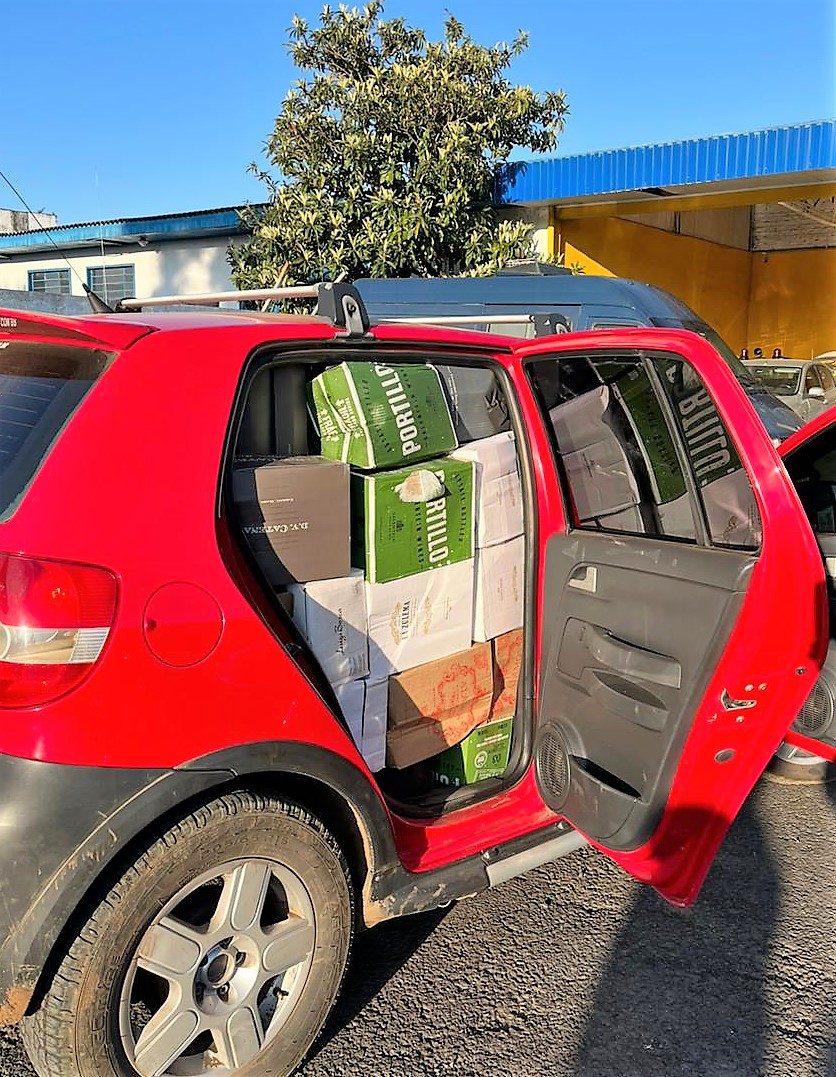 A carga foi encontrada em um VW/Crossfox de Orleans/SC. O motorista não obedeceu ordem de parada e tentou fugir por alguns quilômetros até ser abordado. Além do porta-malas, as caixas com a bebidaocupavam quase todo o interior, do assoalho ao teto do veículo, que estava sem os bancos traseiros para aumentar a capacidade de carga.