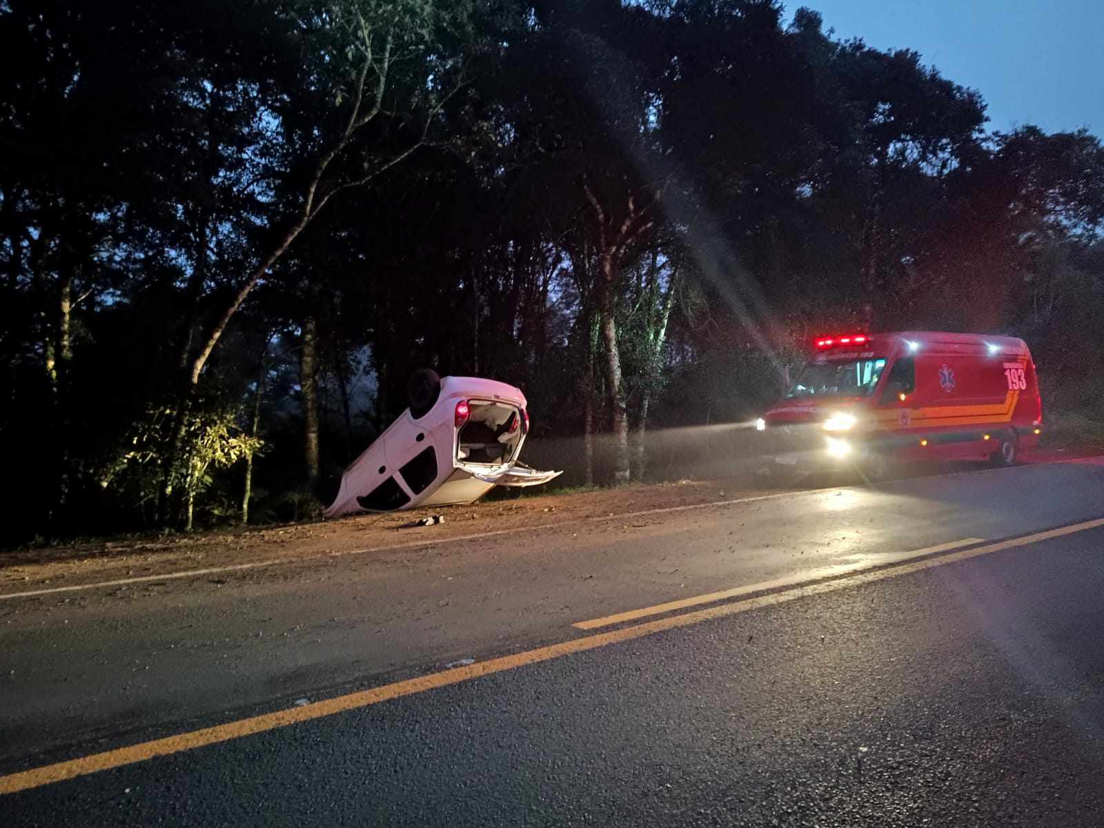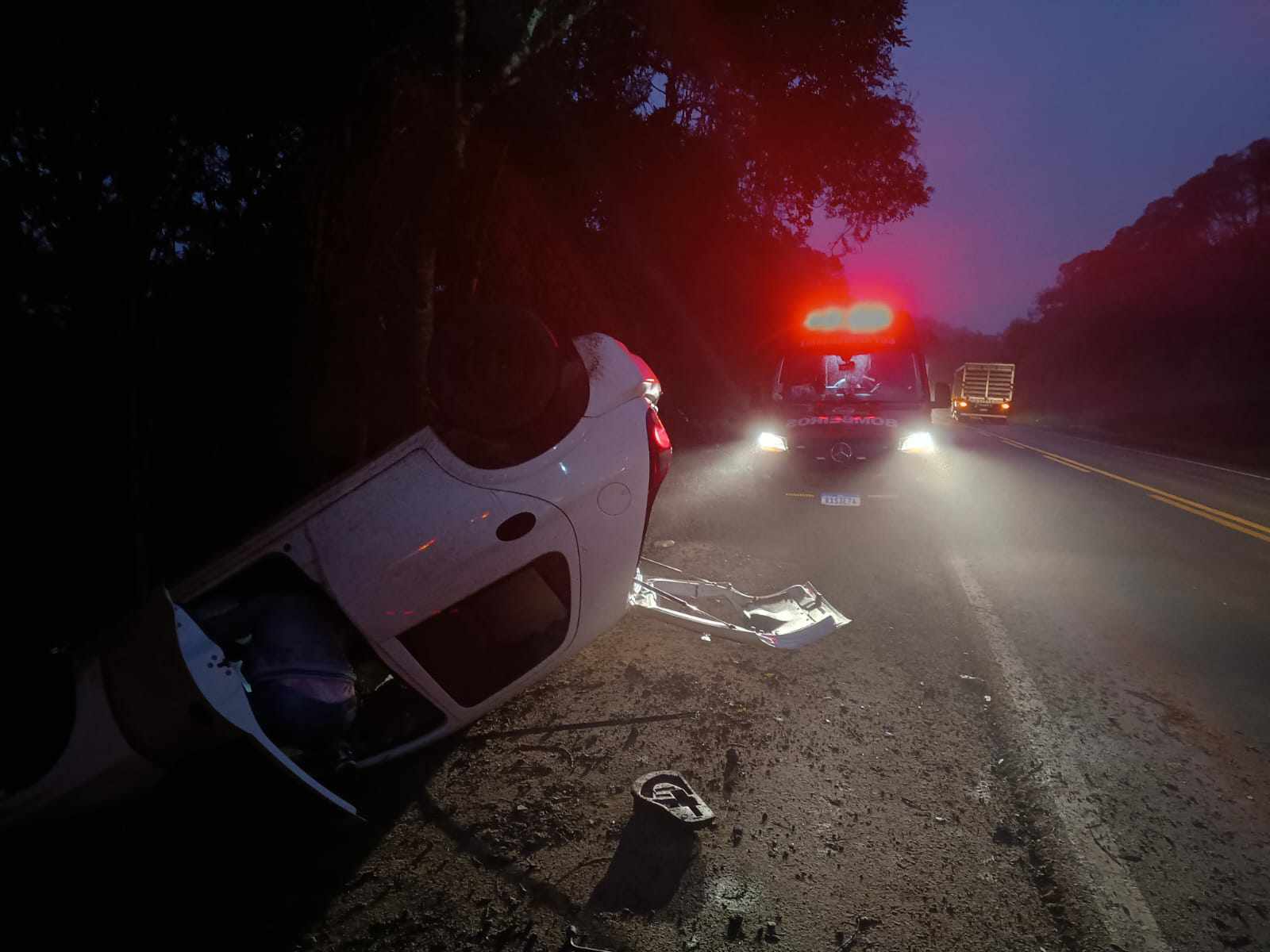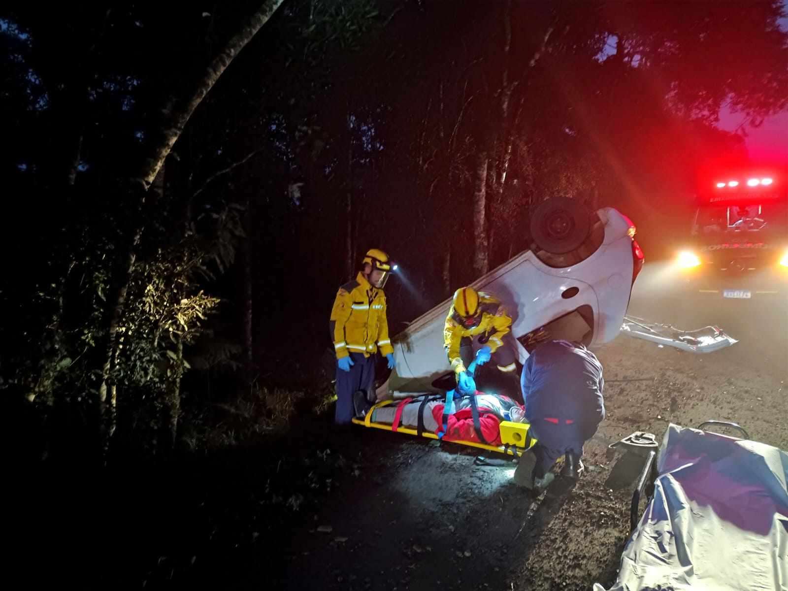 O veículo era conduzido por uma mulher de 28 anos. Ela foi encontrada sentada ao lado do veículo com suspeita de fraturas nas pernas. Foi conduzida ao hospital pela corporação. A Polícia Rodoviária Federal também esteve presente fazendo os levantamentos.
