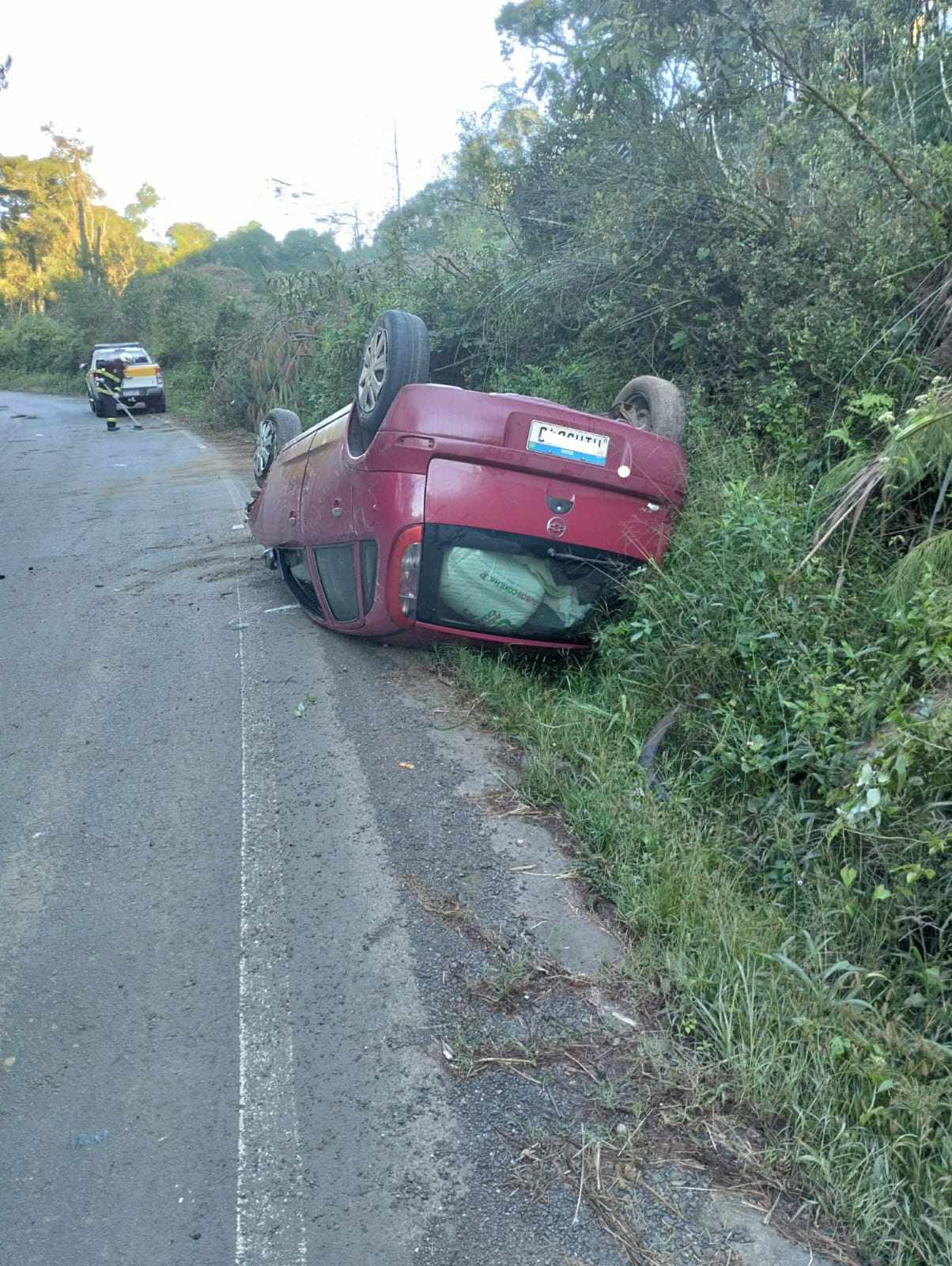 Saída de pista seguida de capotagem envolveu um GM/Corsa com placas de Treze Tílias conduzido pelo idoso de 69 anos. Segundo as informações, ele sofreu lesões leves e foi conduzido ao hospital municipal de Treze Tilias pelos Bombeiros Voluntários de Treze Tílias. O carro parou na borda da pista com os rodados para cima.