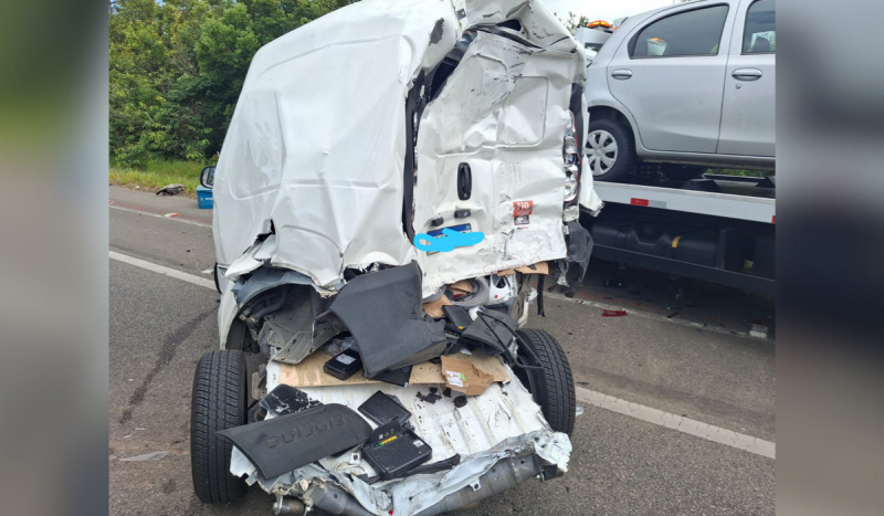 Equipes do Corpo de Bombeiros encontraram um Ford Fiesta preto, um Fiat Fiorino branco e um caminhão com grandes danos causados pelo impacto.