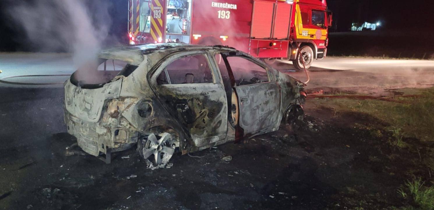 O veículo, um GM Onix, foi encontrado em chamas quando a equipe de socorro chegou ao local. O fogo já havia tomado grande parte do automóvel e foi controlado após a aplicação de água até que as chamas fossem completamente apagadas.