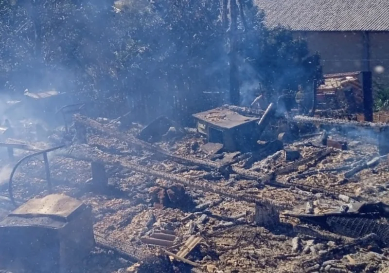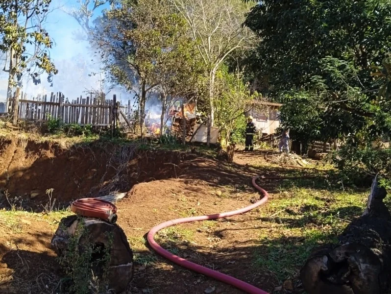 Uma casa foi completamente destruída por um incêndio na manhã desta quarta-feira (25) na comunidade de Linha Coração, interior de Vargem Bonita.