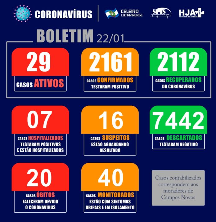 Nesta sexta-feira, dia 22 de janeiro, a Secretaria Municipal de Saúde divulgou o Boletim do Covid-19 que registra nova queda de casos ativos na cidade. São agora 29 casos ativos para Coronavírus.