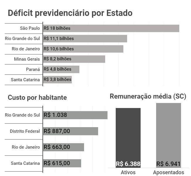 Cada cidadão catarinense desembolsa R$ 615,00 por ano para cobrir o déficit da previdência no Estado, calculado em R$ 3,8 bilhões. É o quarto maior custo por habitante do país, segundo estudo da Federação das Indústrias do Rio de Janeiro (Firjan). O peso só é proporcionalmente maior no Rio Grande do Sul (R$ 1038,00), no Distrito Federal (R$ 887,00) e no Rio de Janeiro (R$ 663,00).