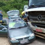 A batida envolveu um Corsa Wagon com placas de Campos Novos e uma carreta bitrem Mercedes-Benz Axor com placas de Campo Erê, no Oeste catarinense. Com o impacto o condutor do Corsa ficou preso nas ferragens. O local foi isolado para o trabalho dos socorristas.
