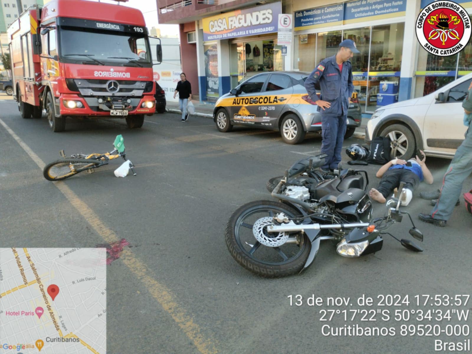 Na tarde desta quarta-feira (13), as equipes de emergência foram acionadas para atender um acidente de trânsito no centro de Curitibanos. O acidente envolveu uma colisão entre uma bicicleta e uma motocicleta, deixando dois homens feridos.