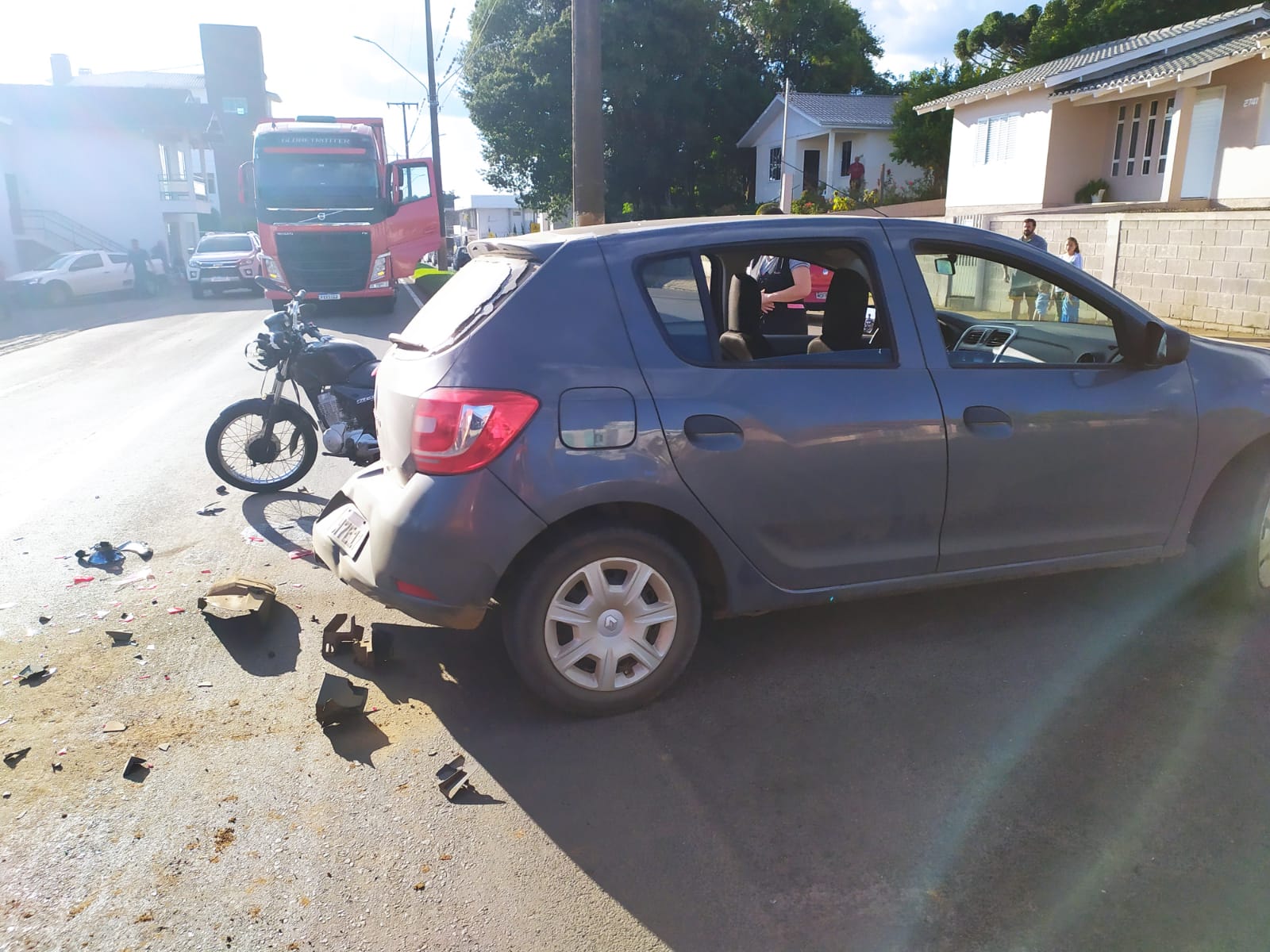 Catanduvas – Por volta das 17h50 desta segunda-feira (13) um acidente de trânsito envolvendo carro e moto foi atendido pelo Corpo de Bombeiros de Catanduvas. A ocorrência foi na rua Celina Leon Carl, bairro Cidade Jardim. Conforme as informações, no local o motociclista estava consciente, orientado, caído no asfalto ainda com o capacete, sinais vitais estáveis, mas apresentando um corte profundo no queixo, escoriações pelo corpo, suspeita de luxação no joelho e tornozelo esquerdos, além de dor e escoriações no braço esquerdo.