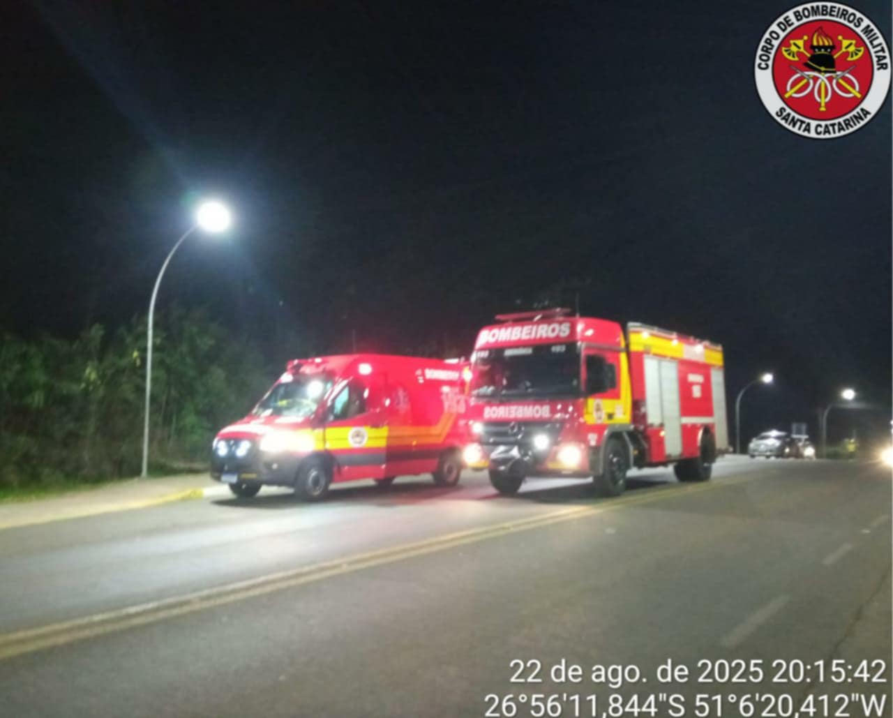 A guarnição encontrou o condutor da motocicleta, homem de 19 anos, caído na rodovia apresentando ferimento abrasivo na perna esquerda, relatava dores no braço esquerdo e edema no crânio na região frontal, sendo que o mesmo estava de capacete. O condutor do caminhão Scania G380, homem de 45 anos, nada sofreu.