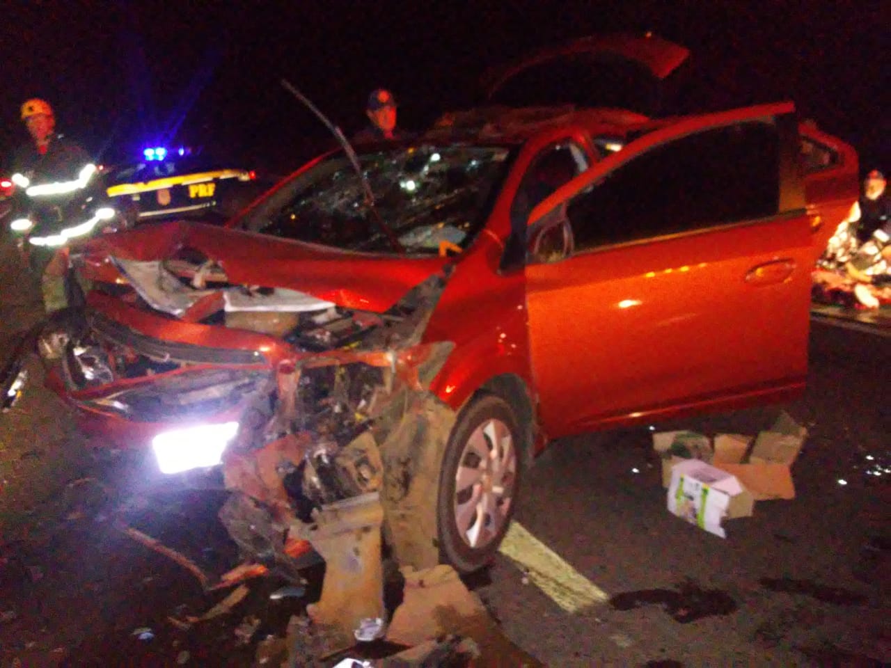 No local os socorristas confirmaram se tratar de uma colisão frontal entre GM/Classic placas da Argentina conduzido por homem de 24 anos, vítima estável, apresentando afundamento de crânio. Encontrava-se andando pelo local com fratura de membro superior, tendo como caronas mulher de 21 anos, vítima estável com ferimentos no joelho e fratura, mulher de 60 anos, vítima estável com ferimento no crânio e fratura de membro superior, criança de 08 anos e criança de 04 anos, estas duas vítimas estáveis.
