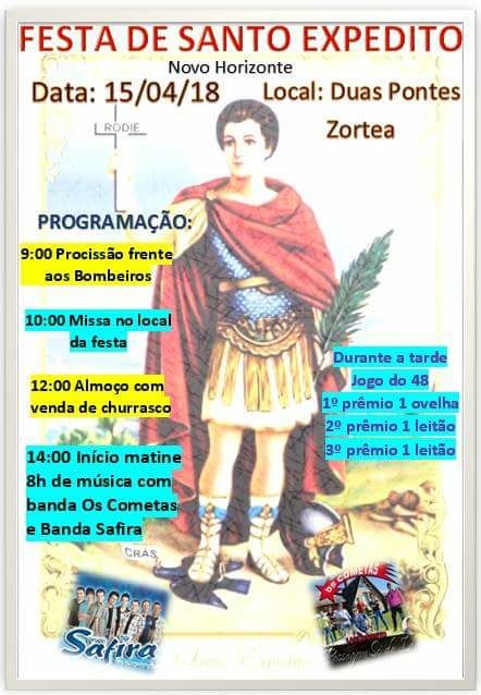 No próximo domingo (15), a comunidade do Loteamento Novo Horizonte promove a festa em honra a Santo Expedito. Como a comunidade não dispõe de um centro comunitário, a festa será realizada no salão da capela de Duas pontes em Zortéa.