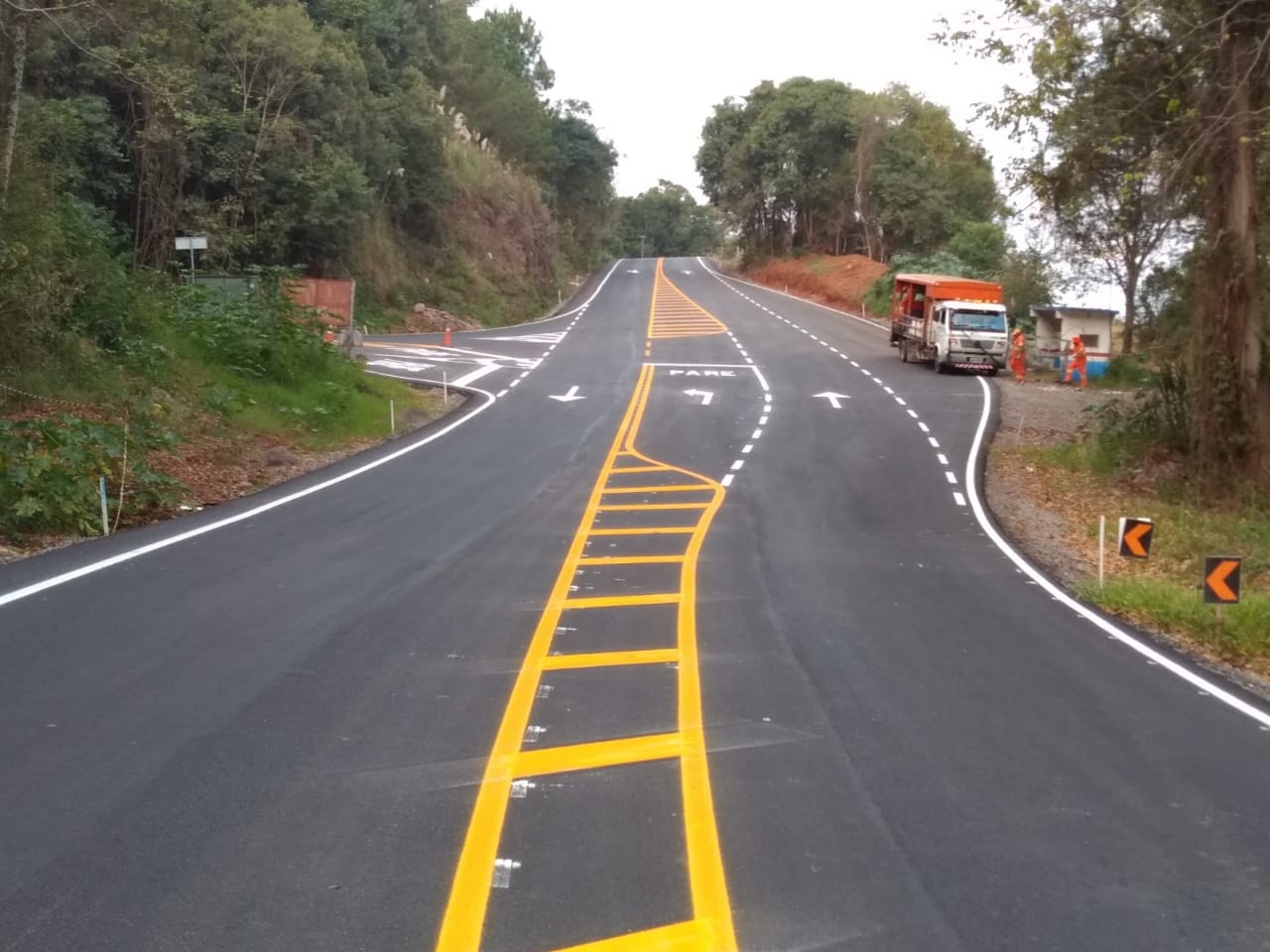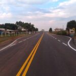 O traçado de cores vivas, recém pintado no primeiro trecho do novo asfalto da rodovia que liga Piratuba (SC), à Maximiliano de Almeida (RS), via barragem da Usina Hidrelétrica Machadinho, chama atenção de quem transita pelo interior da cidade turística.