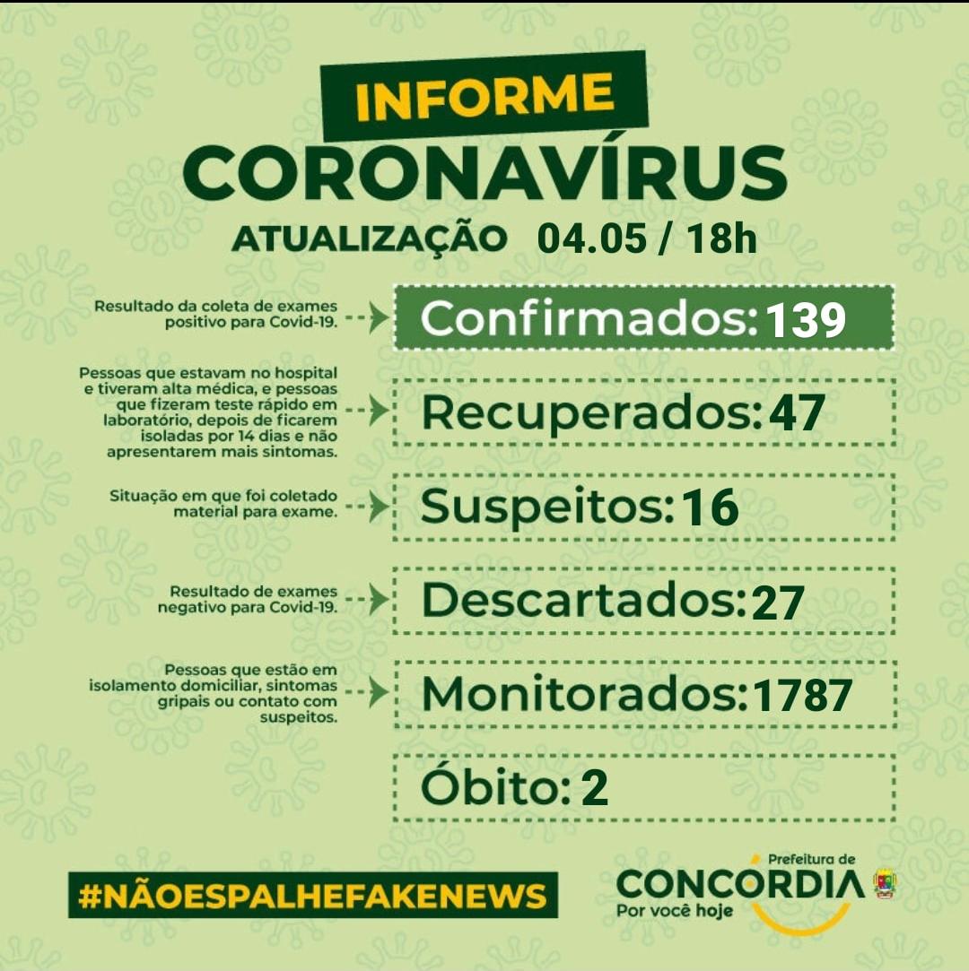 Concórdia – Boletim epidemiológico desta segunda-feira (04) divulgado pelo município de Concórdia mostra que os casos confirmados subiram de 123 para 139. A boa notícia é que o número de recuperados também aumentou, de 44 para 47.