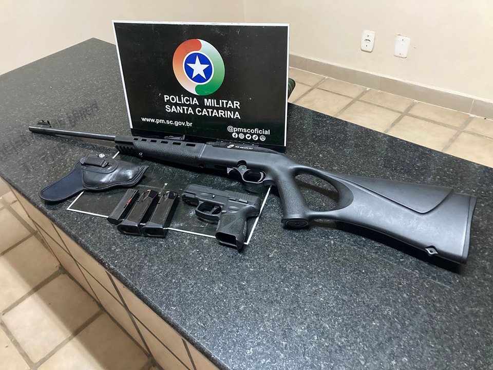 Ao ser questionado, o homem, que apresentava sinais de embriaguez, disse aos policiais que estava levando as armas para sua fazenda, no município de Palmeira (SC).