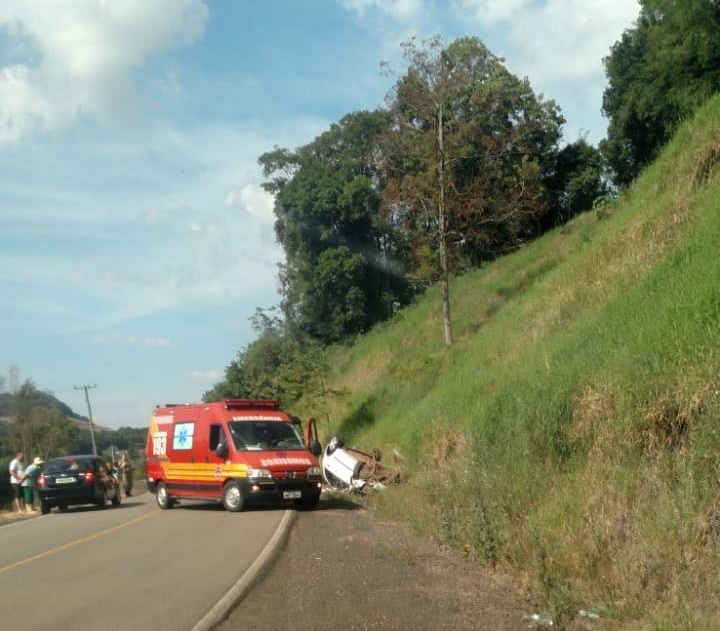 Segundo as informações, um Gol com placas de Joaçaba saiu de pista e capotou no barranco. O carro ficou virado com os rodados para cima no acostamento. O condutor foi atendido primeiramente por um bombeiro voluntário que passava pelo local. Em seguida os socorristas imobilizaram o homem e fizeram a condução ao Hospital Universitário Santa Terezinha de Joaçaba.