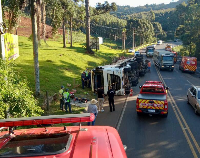 Videira – Um homem morreu e outro ficou ferido após tombamento de carreta na tarde desta quinta-feira (17) na SC-135 em Videira, no meio-oeste. A ocorrência foi por volta das 16h45 no km 129 da rodovia estadual, sentido Pinheiro Preto. Bombeiros de Videira, Tangará e SAMU foram acionados e, no local, constataram que o veículo DAF placas Mercosul, com dois ocupantes, tombou sobre a pista ao realizar uma curva ao final de uma descida.