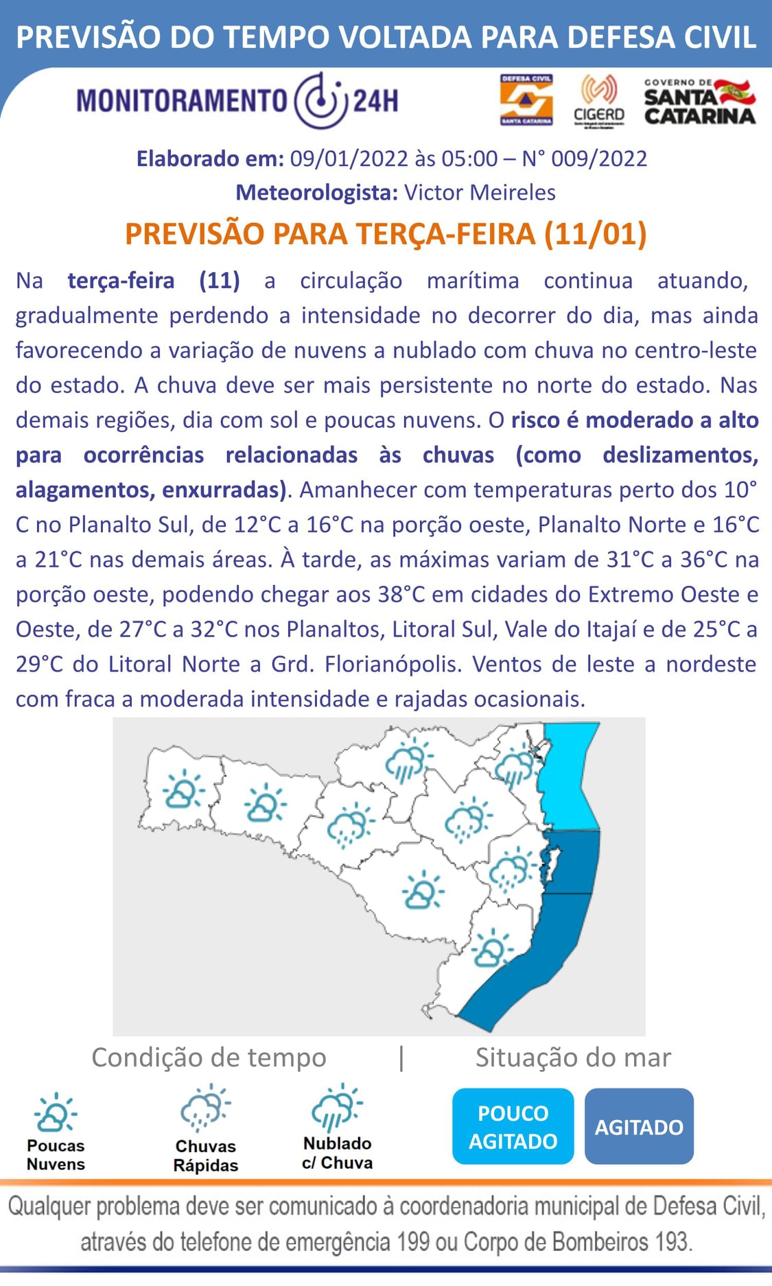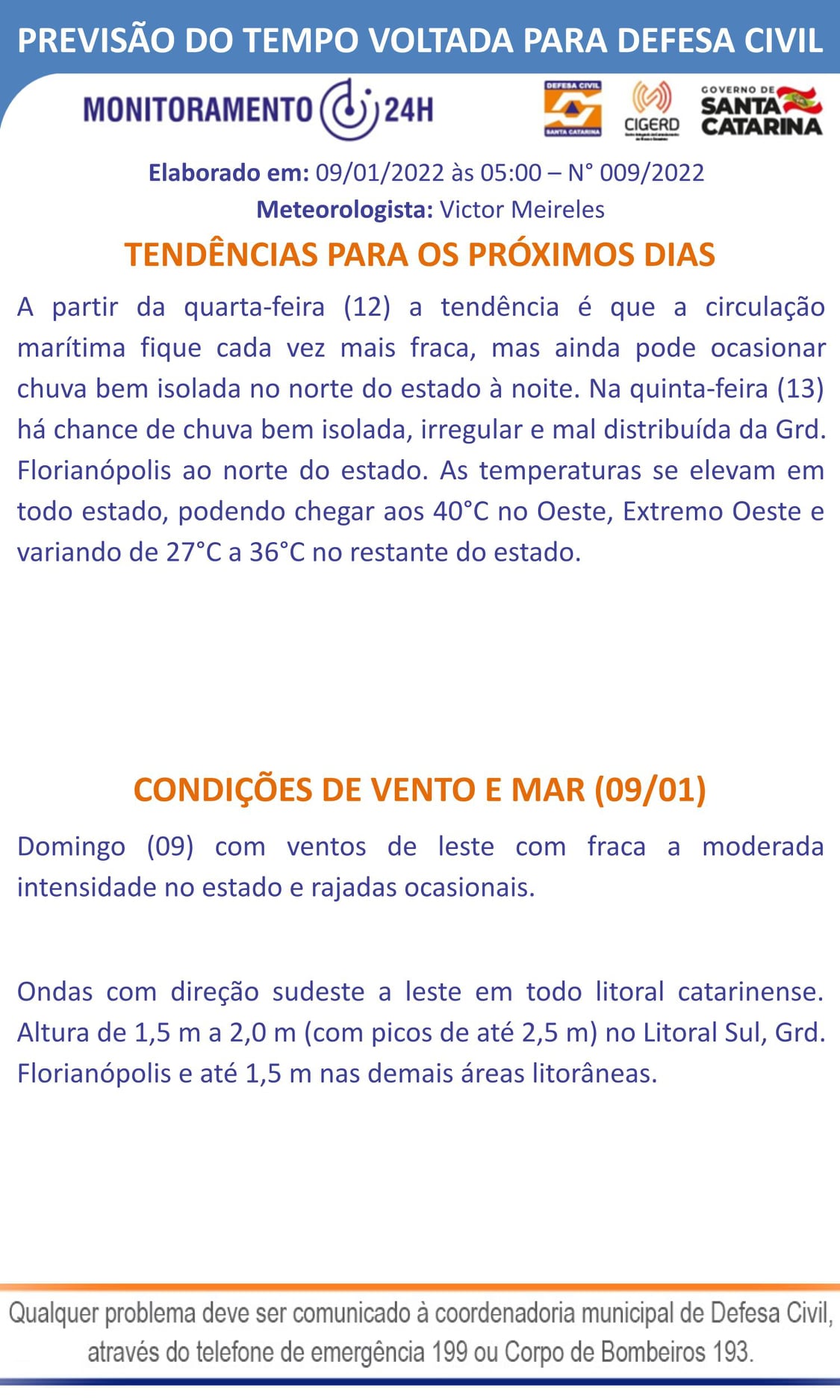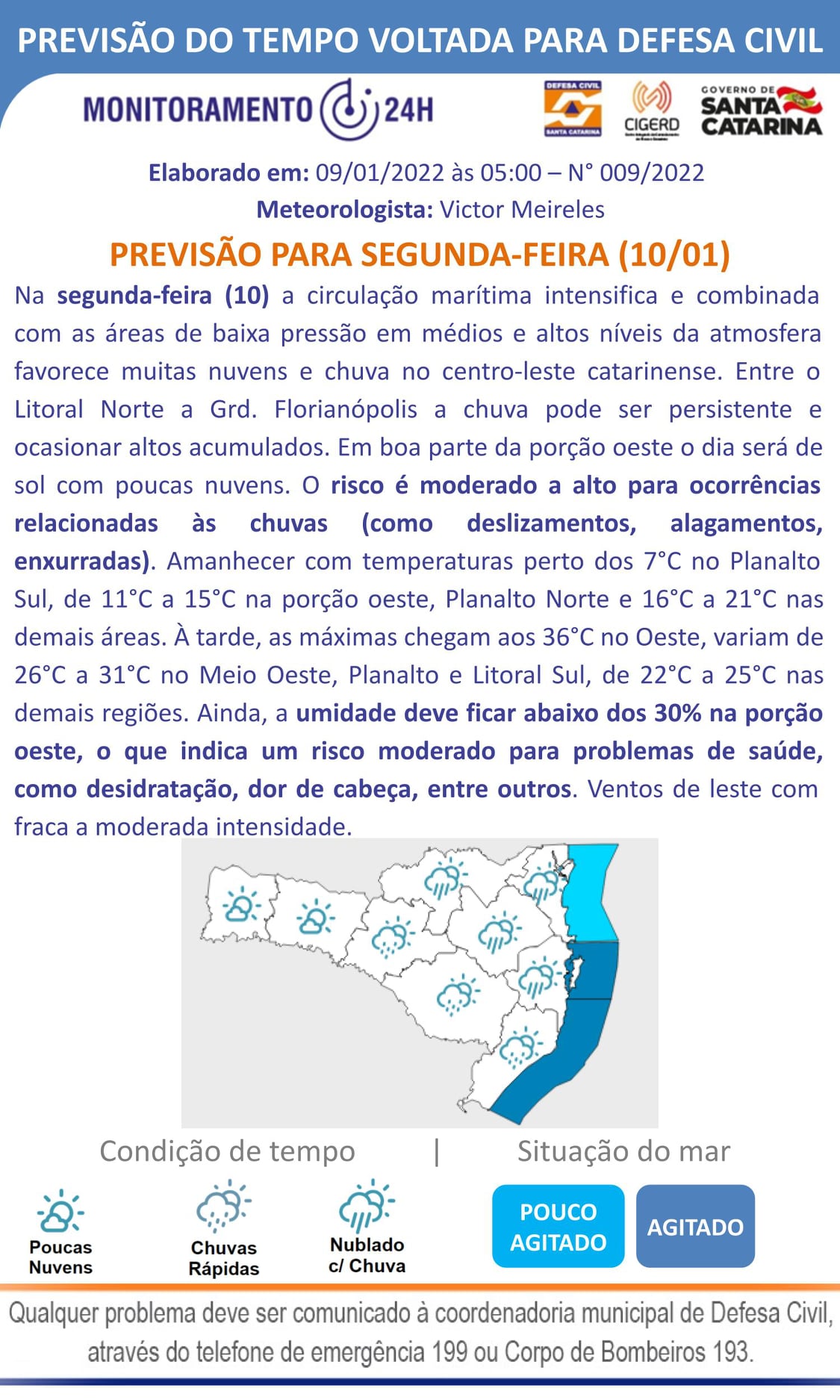 Confira a previsão do tempo para este início de semana em Santa Catarina Região 9 de janeiro de 2022Redação