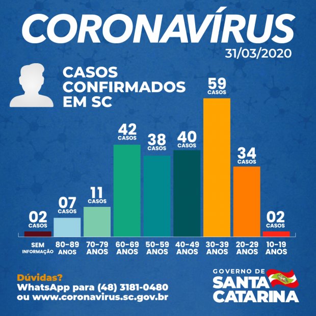 A faixa etária de pessoas entre 30 e 39 anos tem o maior número de casos confirmados de Covid-19 em Santa Catarina, com 25,1% do total. O dado faz parte de um perfil epidemiológico dos infectados montado pela Secretaria de Estado da Saúde e divulgado pelo governador Carlos Moisés nesta terça-feira (31). Neste boletim o total de casos em SC chegou a 235, com 22 deles em leitos de UTI.