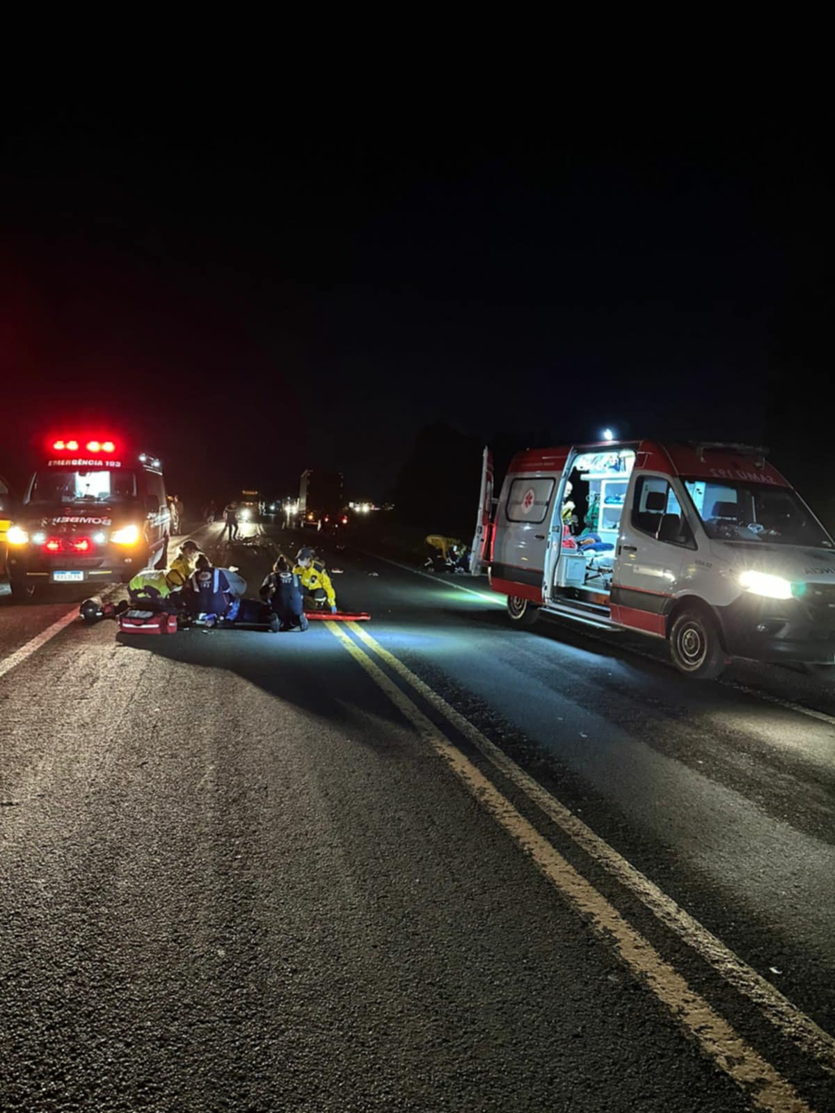 O outro veículo era uma motocicleta Honda CG-150 com placas de Brunópolis-SC conduzida por um jovem de 19 anos, que encontrava-se sobre a pista, politraumatizado, sem sinais vitais, sendo atestado óbito no local pelo médico do SAMU. Ele tinha como passageira uma jovem de 18 anos, que encontrava-se sobre a pista, caída, consciente e orientada, apresentando deformidade no punho esquerdo com suspeita de fratura e relatando dores na região lombar, sendo imobilizada em maca rígida e transportada ao mesmo hospital pelo SAMU.