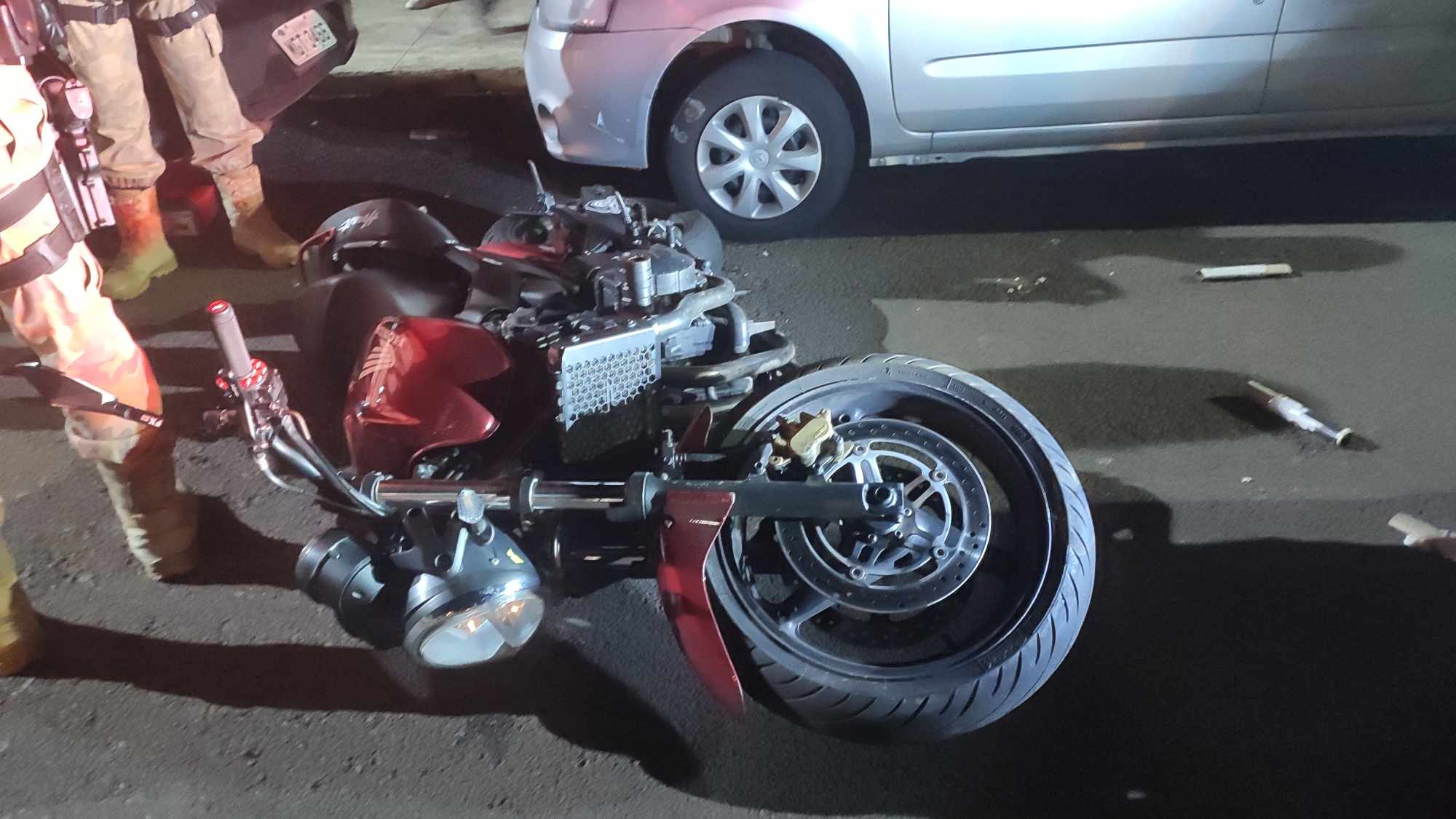 Nesse momento, achando estar desvigiado, um jovem que conduzia motocicleta começou a acelerar e cortar giro do veículo em meio a dezenas de pessoas, tentou empirar a moto, mas perdeu o controle da direção, desequilibrou-se e caiu e atingiu dois automóveis que estavam estacionados. O que ele não contava era que os experientes policiais do Tático estavam no estacionamento logo à frente, na espreita, e, assim que ouviu a aceleração da moto, já se dirigiu ao ponto.