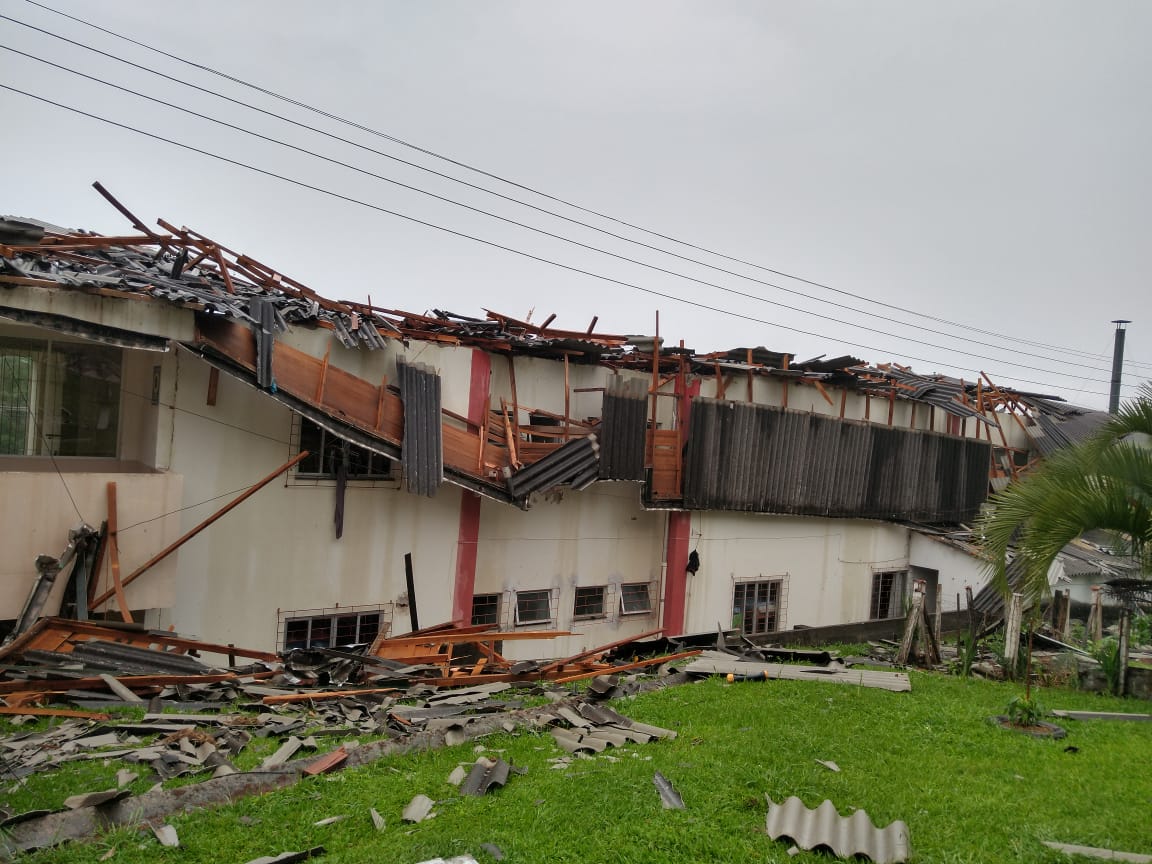 Danos Materiais: Telhado parcial de duas (02) residências, parte de alvenaria e telhado de ginásios de esportes e cobertura de posto de combustível