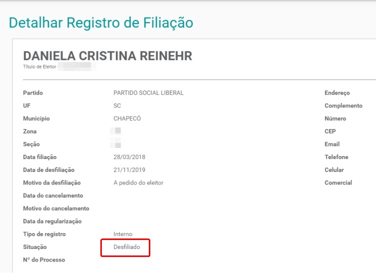 Daniela Reinehr, está oficialmente desfiliada do PSL, partido pelo qual foi eleita em outubro de 2018 para o seu primeiro cargo eletivo. Recentemente, já havia se manifestado publicamente em um evento em Criciúma, no Sul, com a presença do deputado federal Eduardo Bolsonaro de que seguiria com o novo partido do presidente da República, com o qual, afirmou, que sempre manteve a lealdade e os princípios.
