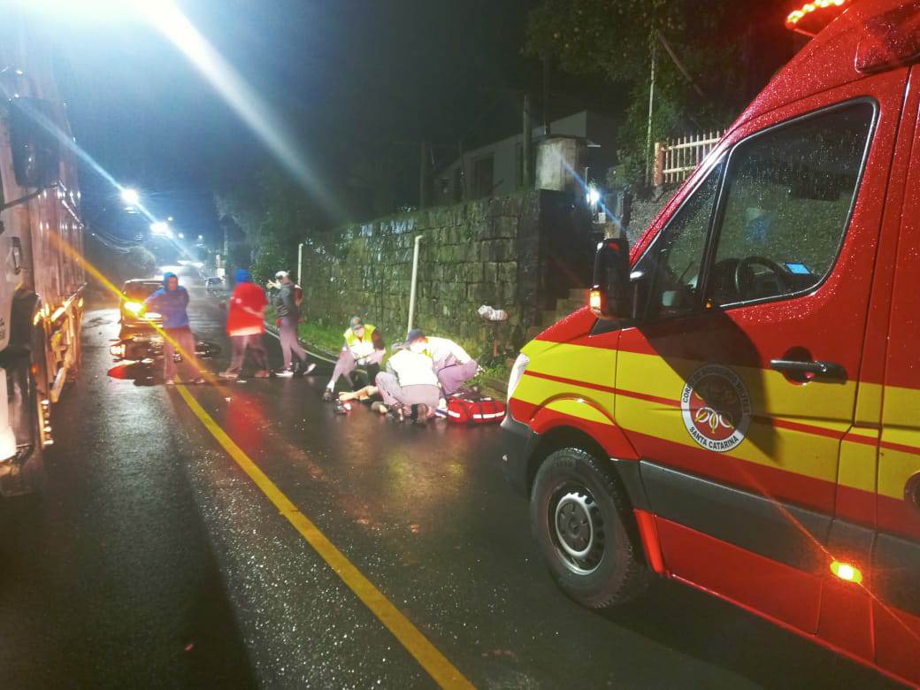 A motocicleta era conduzida por uma mulher de 24 anos que estava caída em via pública, consciente, orientada, estável, apresentando ferimento e suspeita de fratura na perna direita. A paciente relatou que saiu do trabalho e se dirigia para casa, mas não lembra do que aconteceu para ocorrer a colisão.