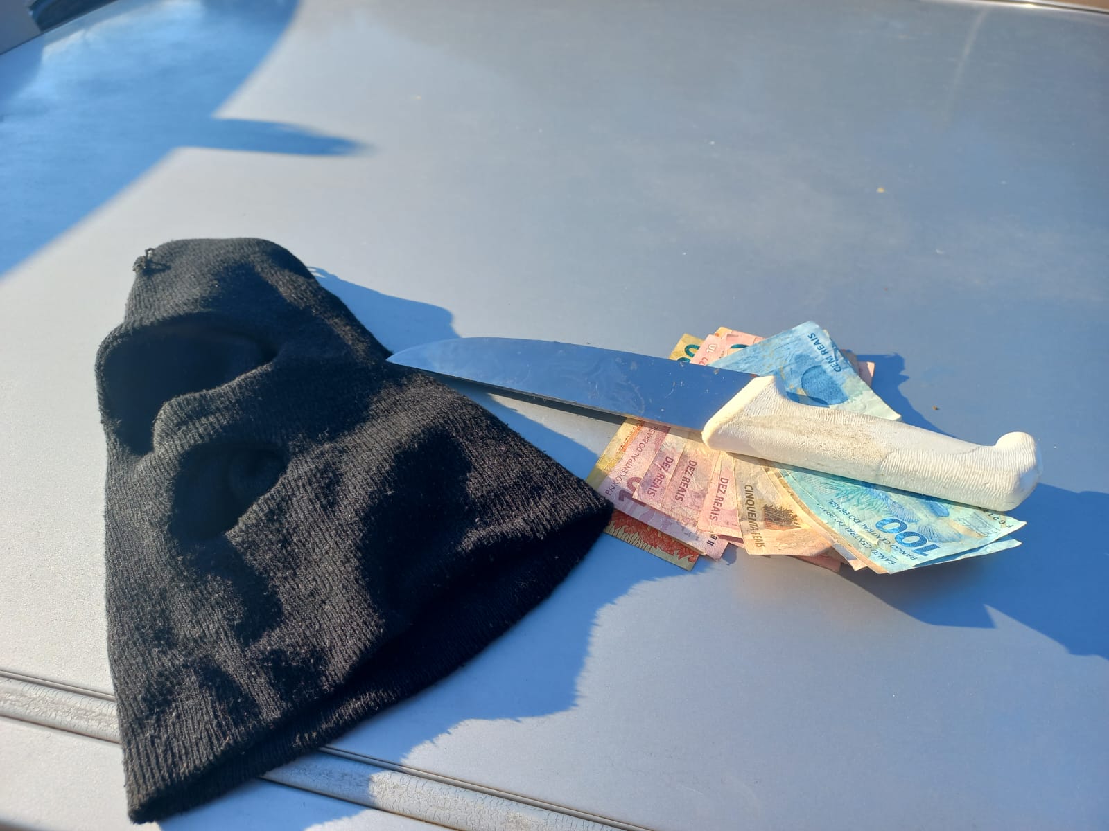 Os autores foram abordados em um veículo Siena de Videira, que estava sem a placa dianteira. Com eles, foram apreendidos mais de 400 reais em dinheiro, além de uma faca e uma balaclava utilizadas no crime.