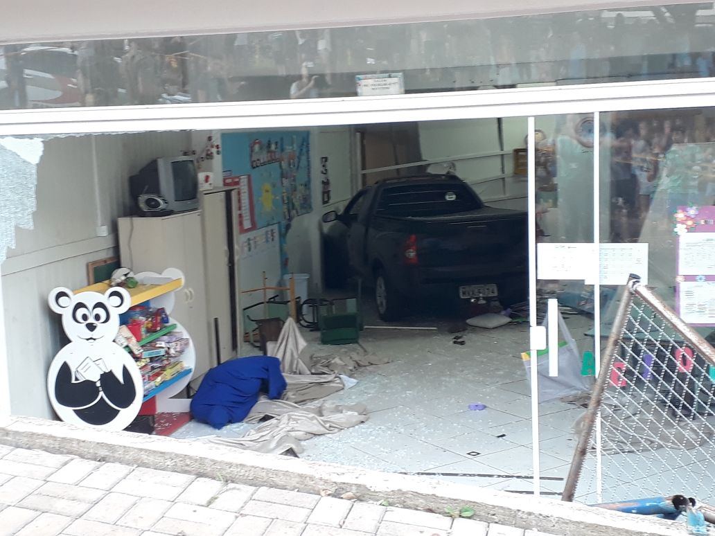 A sala onde estavam 24 crianças de 4 a 5 anos, que fica num patamar mais baixo do que a rua, foi invadida por um Chevrolet Montana com placas de Chapecó na tarde de terça-feira. O carro derrubou a grade, quebrou a porta de vidro e entrou cerca de 12 metros na sala, deixando pelo menos oito crianças feridas, segundo boletim policial.
